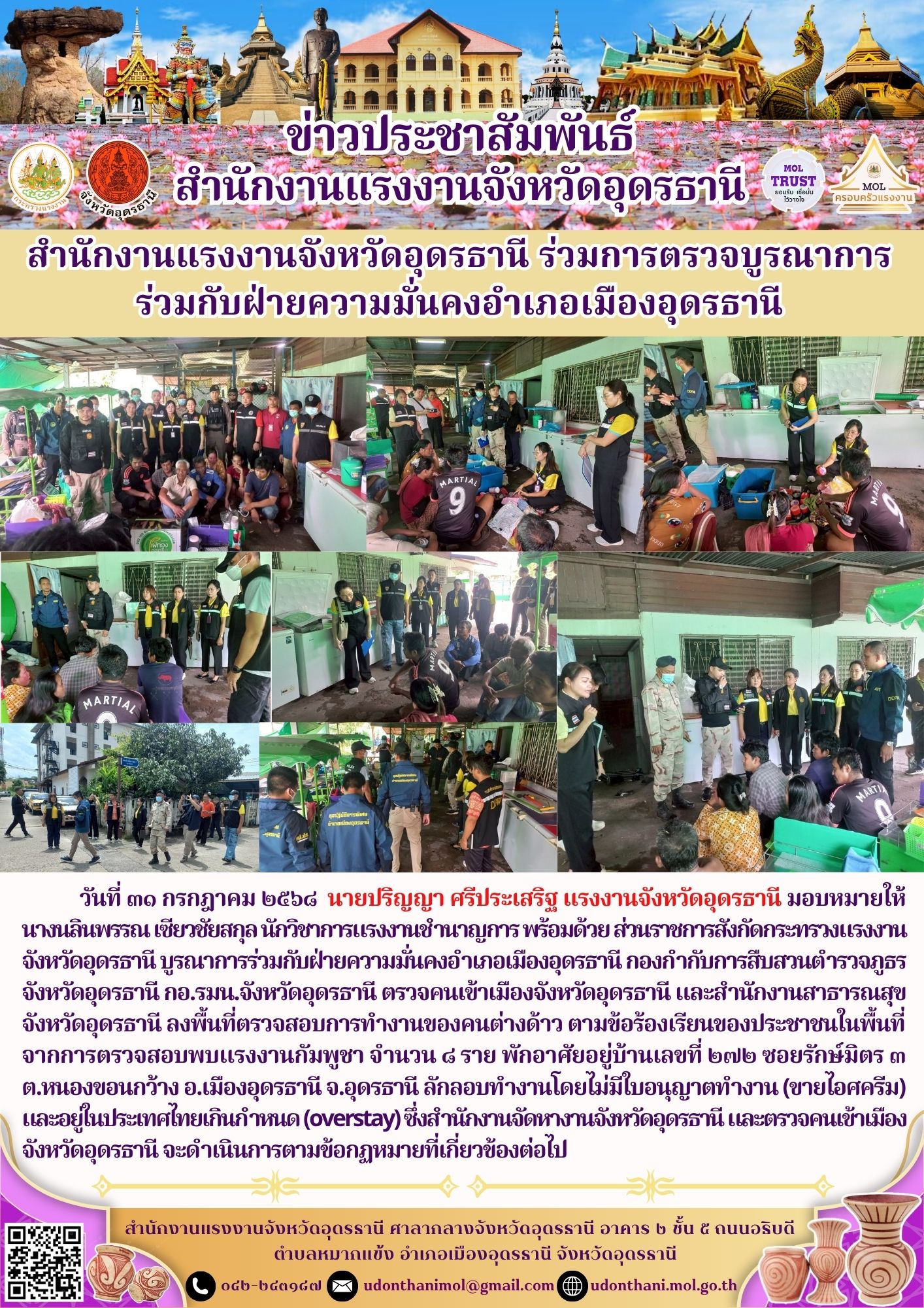 สำนักงานแรงงานจังหวัดอุดรธานี ร่วมการตรวจบูรณาการร่วมกับฝ่ายความมั่นคงอำเภอเมืองอุดรธานี