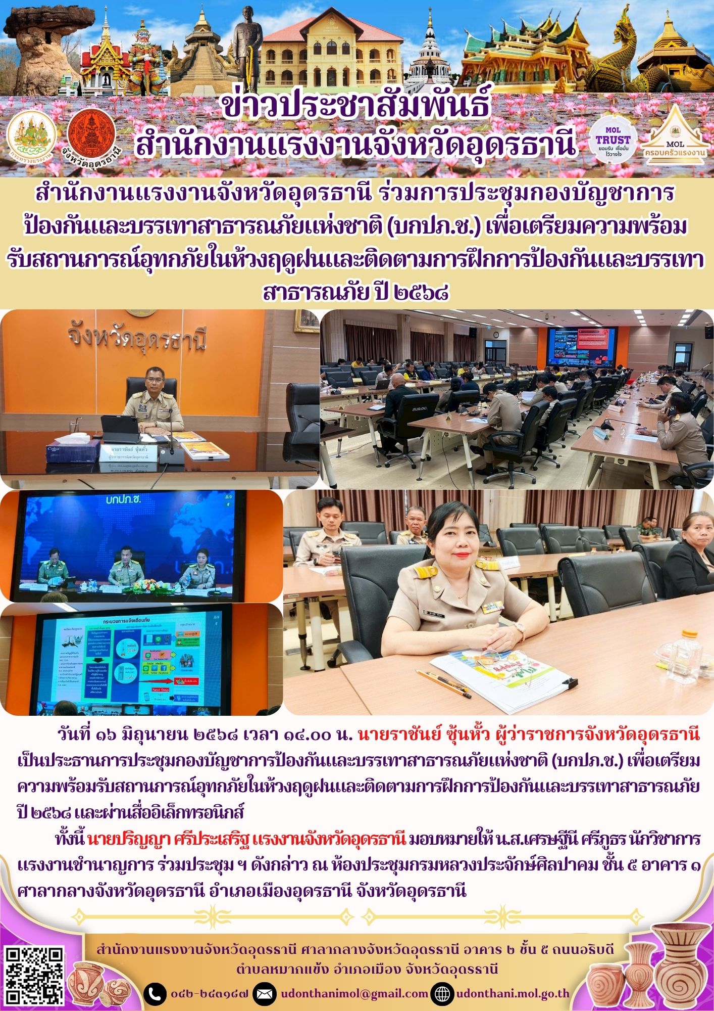 สำนักงานแรงงานจังหวัดอุดรธานี ร่วมการประชุมกองบัญชาการ ป้องกันและบรรเทาสาธารณภัยแห่งชาติ (บกปภ.ช.) เพื่อเตรียมความพร้อม รับสถานการณ์อุทกภัยในห้วงฤดูฝนและติดตามการฝึกการป้องกันและบรรเทาสาธารณภัย ปี ๒๕๖๘