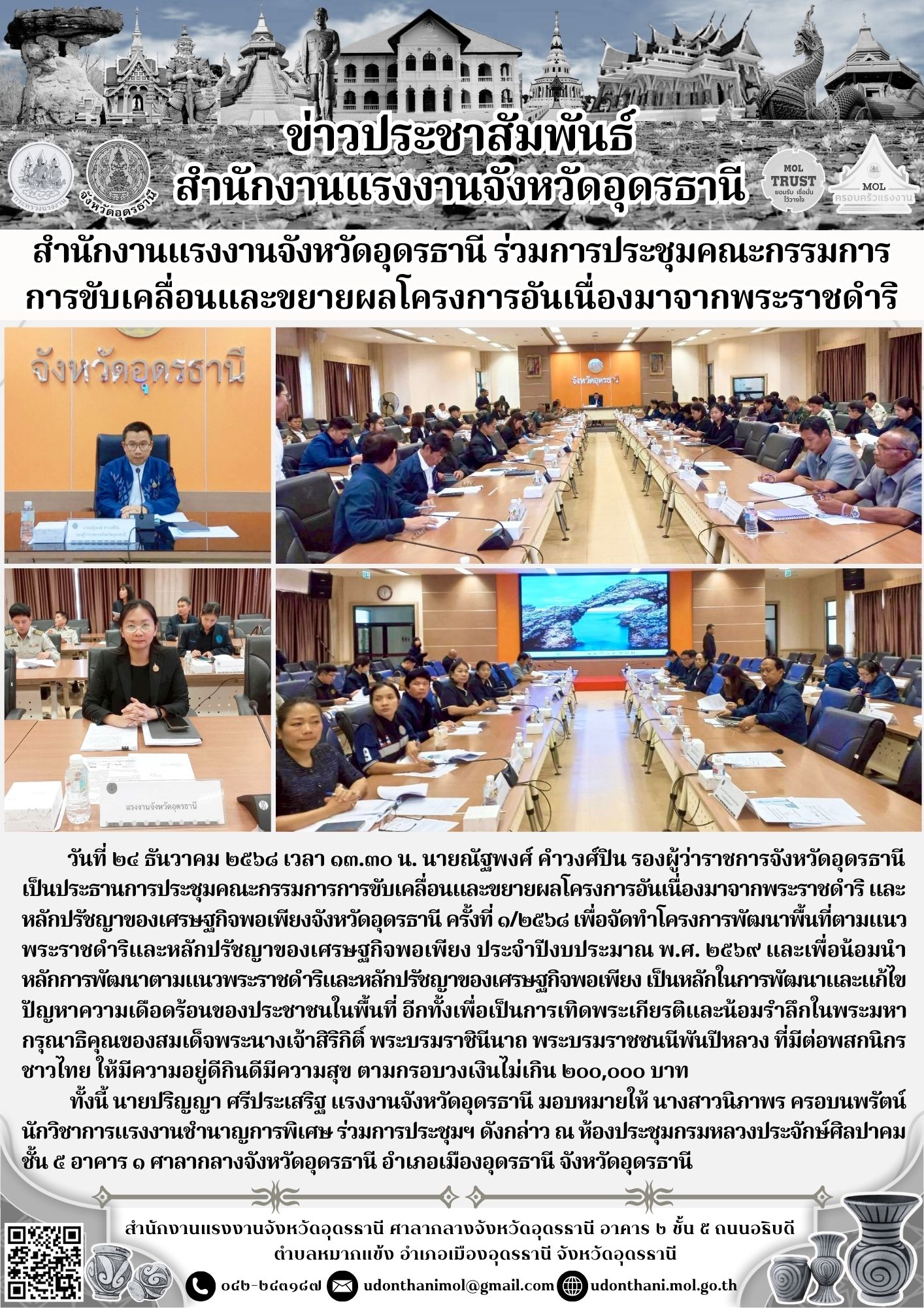 สำนักงานแรงงานจังหวัดอุดรธานี ร่วมการประชุมคณะกรรมการการขับเคลื่อนและขยายผลโครงการอันเนื่องมาจากพระราชดำริ