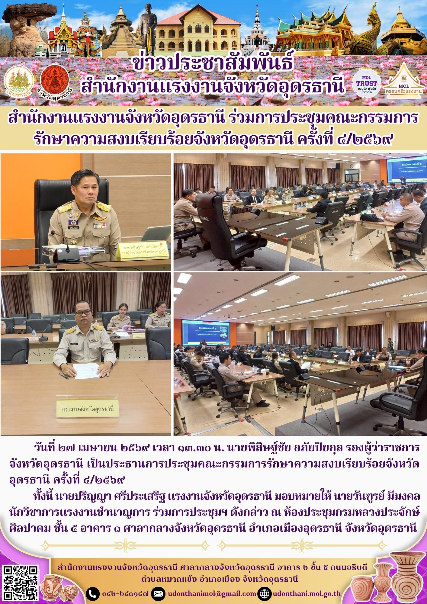 สำนักงานแรงงานจังหวัดอุดรธานี ร่วมการประชุมคณะกรรมการรักษาความสงบเรียบร้อยจังหวัดอุดรธานี ครั้งที่ ๔/๒๕๖๙
