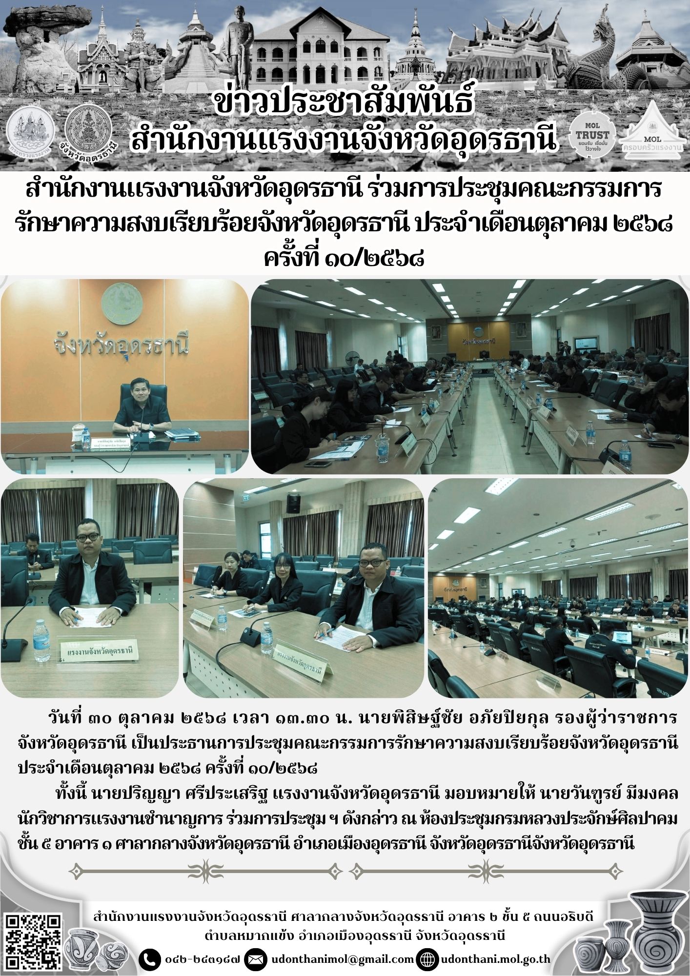 สำนักงานแรงงานจังหวัดอุดรธานี ร่วมการประชุมคณะกรรมการ รักษาความสงบเรียบร้อยจังหวัดอุดรธานี ประจำเดือนตุลาคม ๒๕๖๘ ครั้งที่ ๑๐/๒๕๖๘