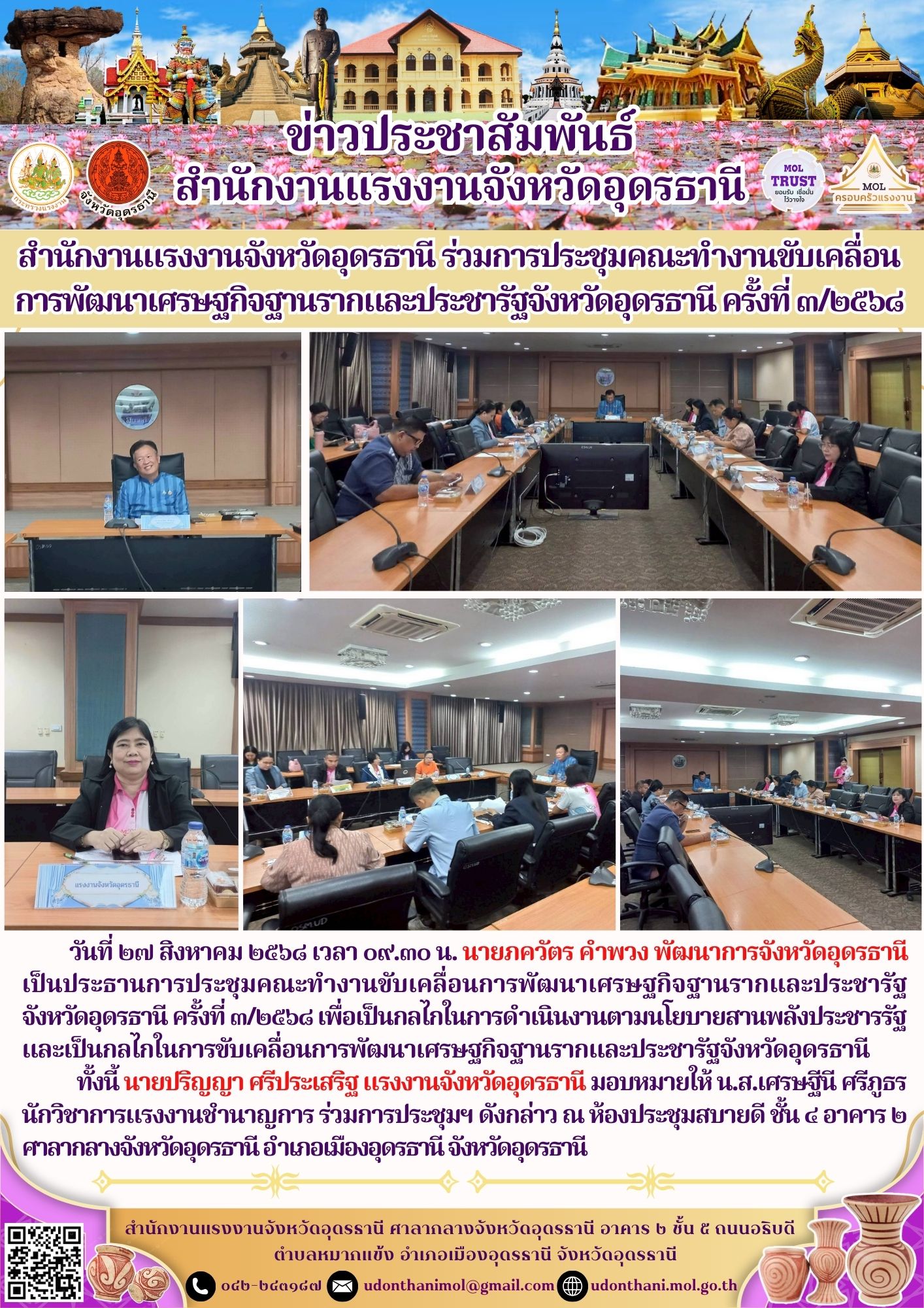 สำนักงานแรงงานจังหวัดอุดรธานี ร่วมการประชุมคณะทำงานขับเคลื่อนการพัฒนาเศรษฐกิจฐานรากและประชารัฐจังหวัดอุดรธานี ครั้งที่ ๓/๒๕๖๘