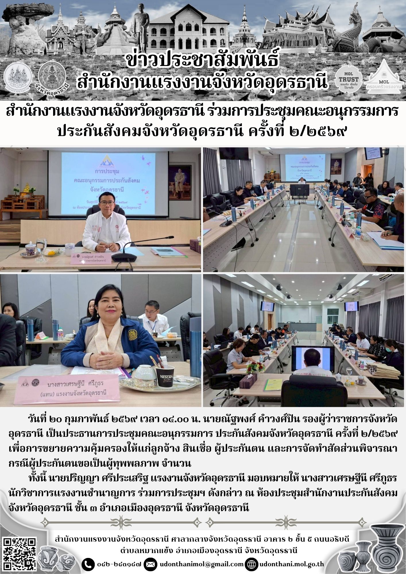 สำนักงานแรงงานจังหวัดอุดรธานี ร่วมการประชุมคณะอนุกรรมการประกันสังคมจังหวัดอุดรธานี ครั้งที่ ๒/๒๕๖๙