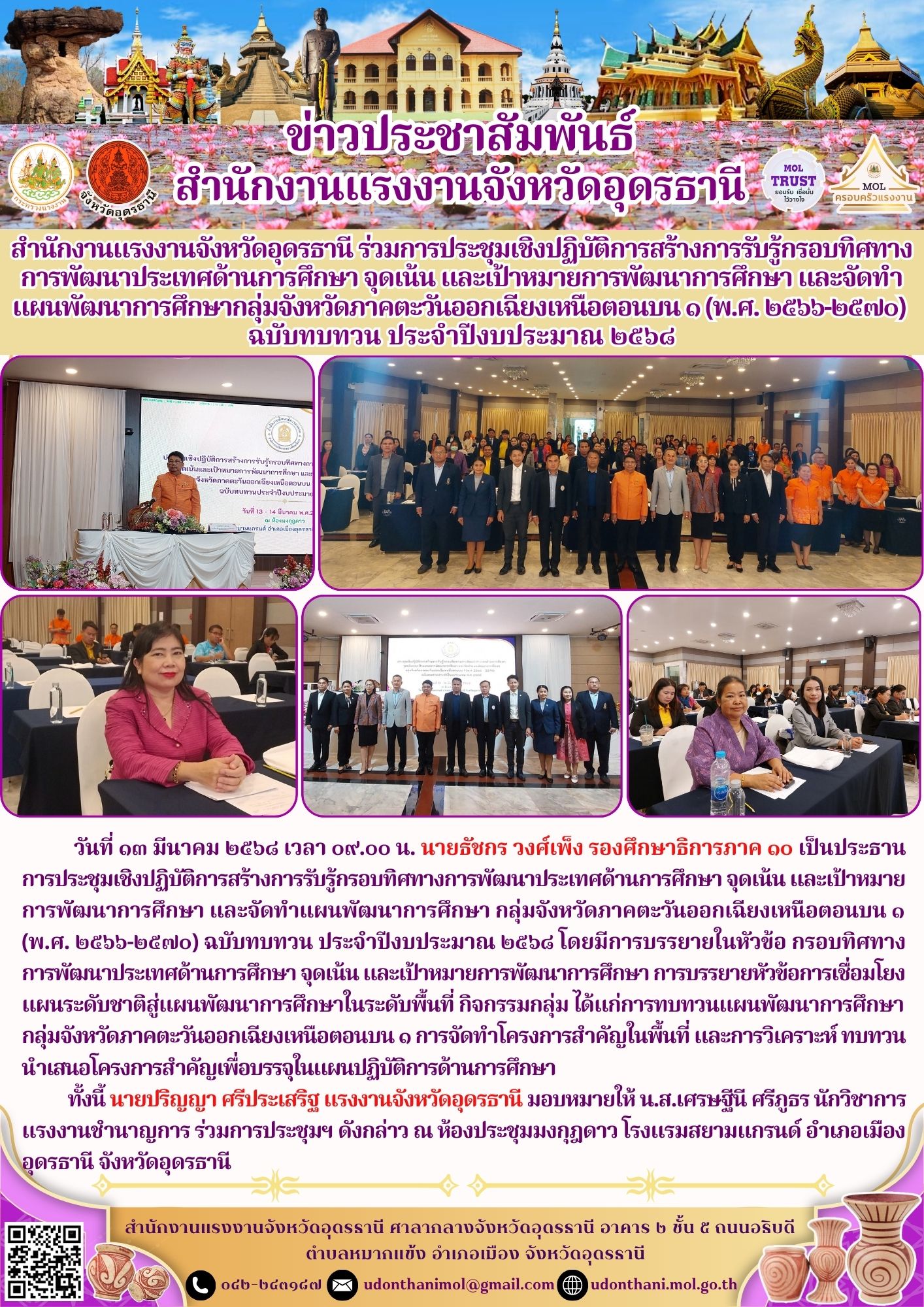 สำนักงานแรงงานจังหวัดอุดรธานี ร่วมการประชุมเชิงปฏิบัติการสร้างการรับรู้กรอบทิศทาง การพัฒนาประเทศด้านการศึกษา จุดเน้น และเป้าหมายการพัฒนาการศึกษาและจัดทำแผนพัฒนาการศึกษากลุ่มจังหวัดภาคตะวันออกเฉียงเหนือตอนบน ๑ (พ.ศ. ๒๕๖๖-๒๕๗๐) ฉบับทบทวน ประจำปีงบประมาณ ๒๕๖๘