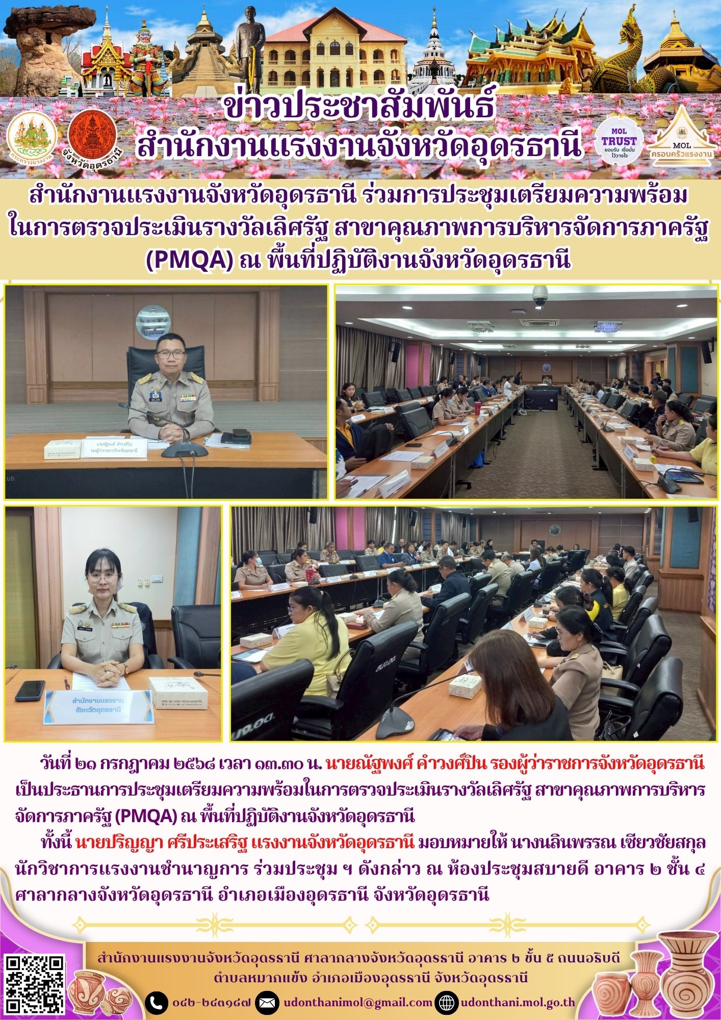 สำนักงานแรงงานจังหวัดอุดรธานี ร่วมการประชุมเตรียมความพร้อม ในการตรวจประเมินรางวัลเลิศรัฐ สาขาคุณภาพการบริหารจัดการภาครัฐ (PMQA) ณ พื้นที่ปฏิบัติงานจังหวัดอุดรธานี