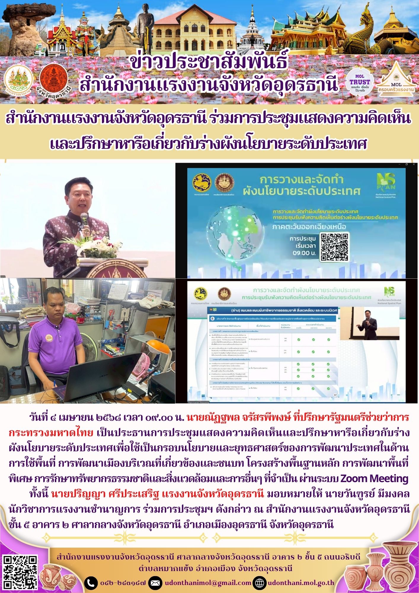 สำนักงานแรงงานจังหวัดอุดรธานี ร่วมการประชุมแสดงความคิดเห็นและปรึกษาหารือเกี่ยวกับร่างผังนโยบายระดับประเทศ