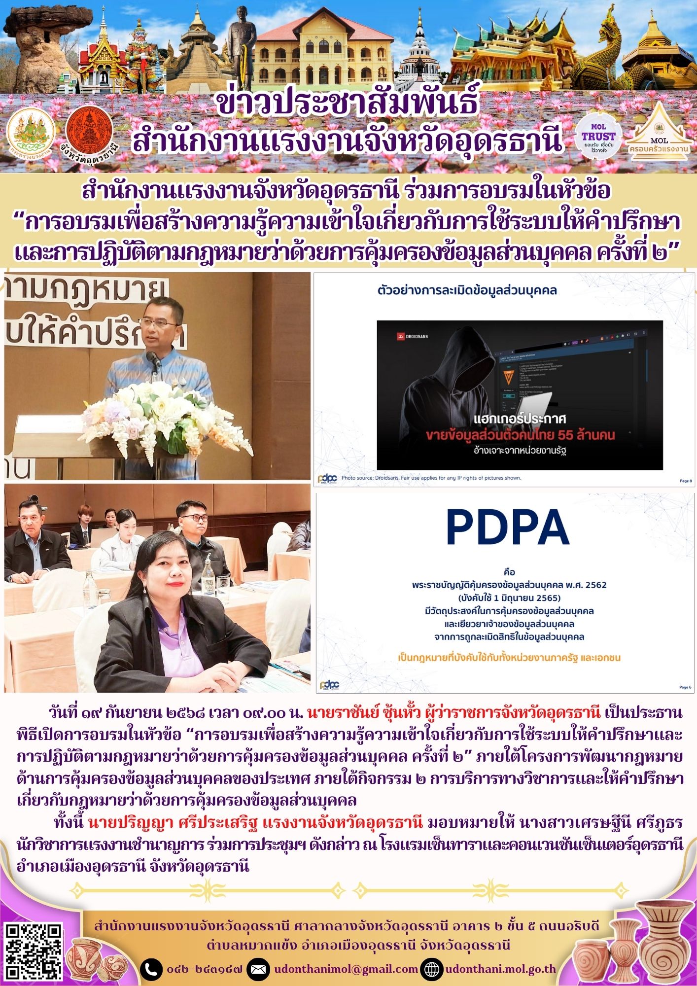 สำนักงานแรงงานจังหวัดอุดรธานี ร่วมการอบรมในหัวข้อ “การอบรมเพื่อสร้างความรู้ความเข้าใจเกี่ยวกับการใช้ระบบให้คำปรึกษาและการปฏิบัติตามกฎหมายว่าด้วยการคุ้มครองข้อมูลส่วนบุคคล ครั้งที่ ๒”