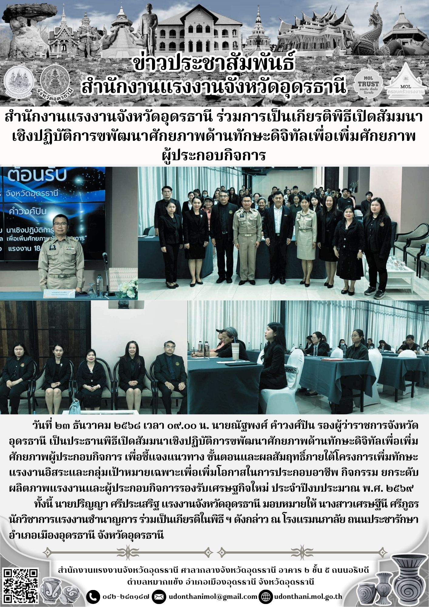สำนักงานแรงงานจังหวัดอุดรธานี ร่วมการเป็นเกียรติพิธีเปิดสัมมนาเชิงปฏิบัติการฃพัฒนาศักยภาพด้านทักษะดิจิทัลเพื่อเพิ่มศักยภาพผู้ประกอบกิจการ