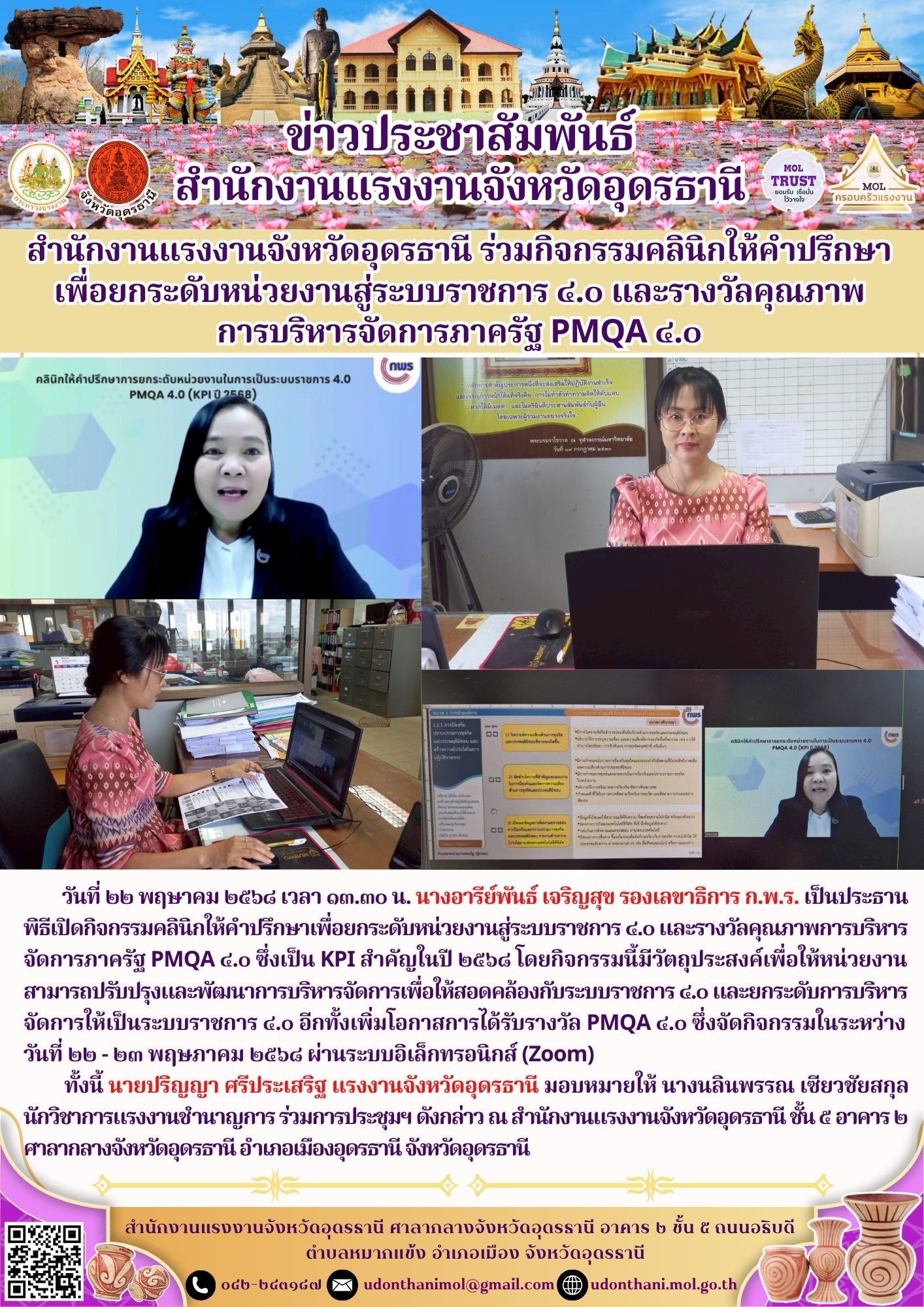 สำนักงานแรงงานจังหวัดอุดรธานี ร่วมกิจกรรมคลินิกให้คำปรึกษาเพื่อยกระดับหน่วยงานสู่ระบบราชการ ๔.๐ และรางวัลคุณภาพการบริหารจัดการภาครัฐ PMQA ๔.๐