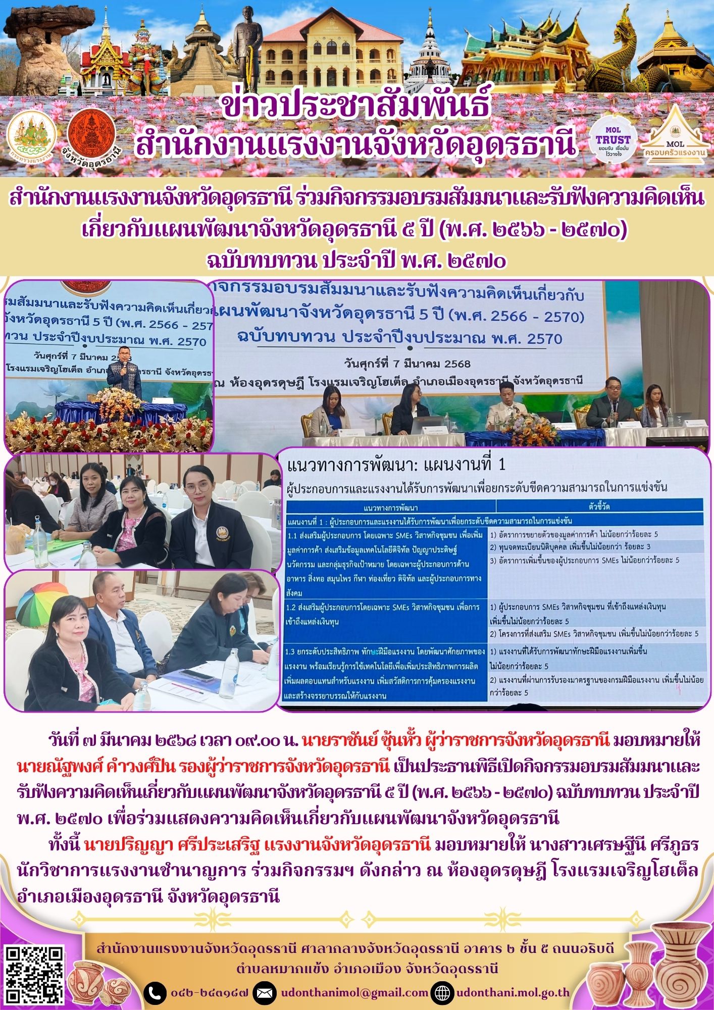 สำนักงานแรงงานจังหวัดอุดรธานี ร่วมกิจกรรมอบรมสัมมนาและรับฟังความคิดเห็นเกี่ยวกับแผนพัฒนาจังหวัดอุดรธานี ๕ ปี (พ.ศ. ๒๕๖๖ – ๒๕๗๐) ฉบับทบทวน ประจำปี พ.ศ. ๒๕๗๐