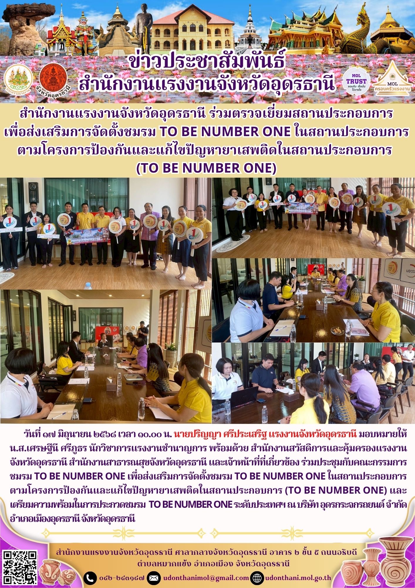 สำนักงานแรงงานจังหวัดอุดรธานี ร่วมตรวจเยี่ยมสถานประกอบการเพื่อส่งเสริมการจัดตั้งชมรม TO BE NUMBER ONE ในสถานประกอบการ ตามโครงการป้องกันและแก้ไขปัญหายาเสพติดในสถานประกอบการ (TO BE NUMBER ONE)