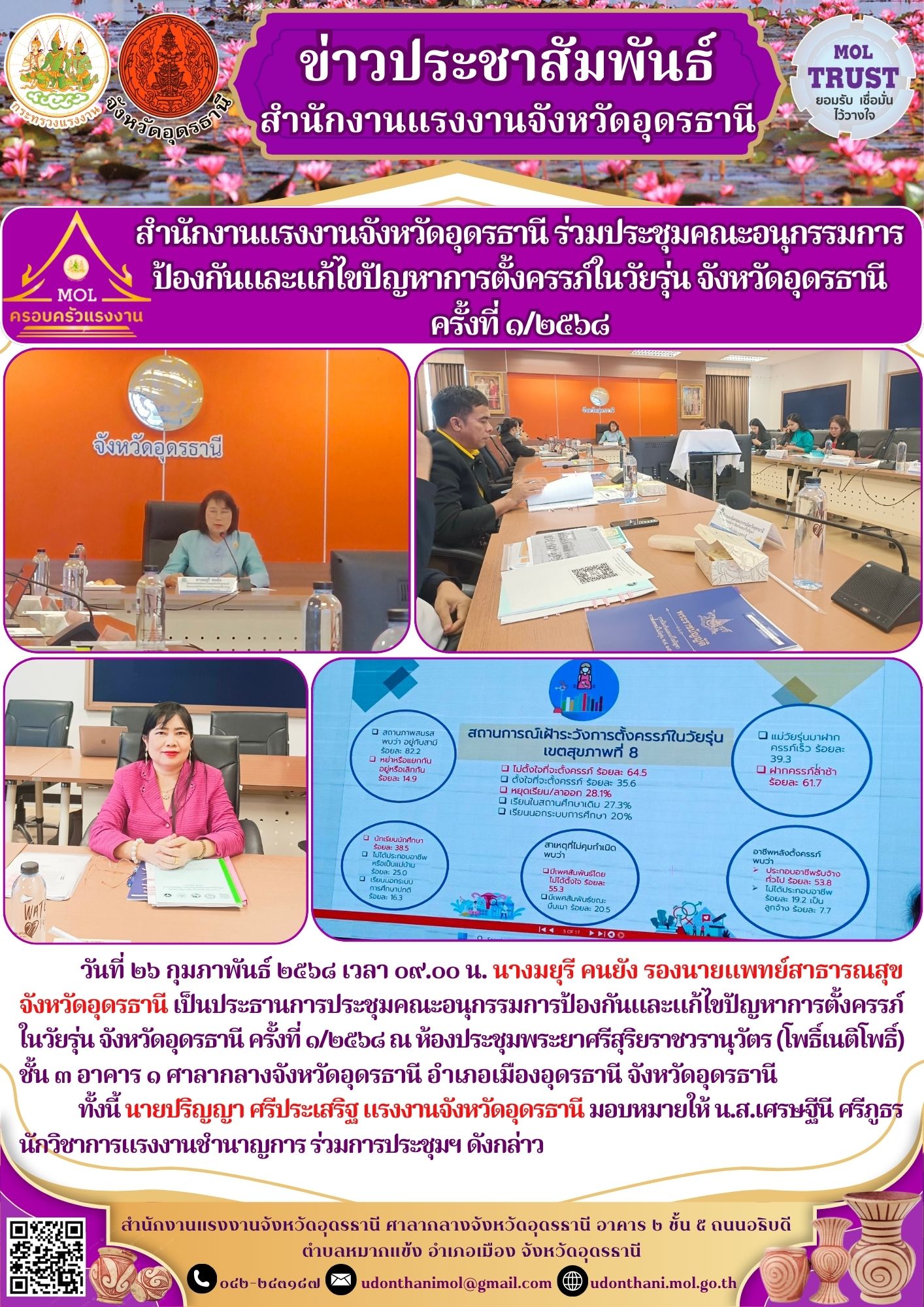 สำนักงานแรงงานจังหวัดอุดรธานี ร่วมประชุมคณะอนุกรรมการป้องกันและแก้ไขปัญหาการตั้งครรภ์ในวัยรุ่นจังหวัดอุดรธานี ครั้งที่ ๑/๒๕๖๘