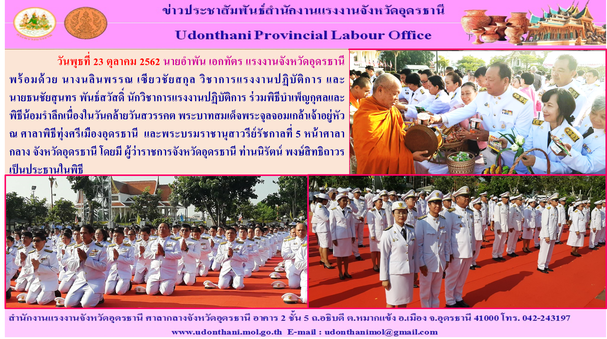 สำนักงานแรงงานจังหวัดอุดรธานี ร่วมพิธีจุดเทียนเพื่อน้อมรำลึกในพระมหากรุณาธิคุณ พระบาทสมเด็จพระจุลจอมเกล้าเจ้าอยู่หัว ณ พระบรมราชานุสาวรีย์รัชกาลที่ 5 หน้าศาลากลางจังหวัดอุดรธานี 23 ตุลาคม 2562