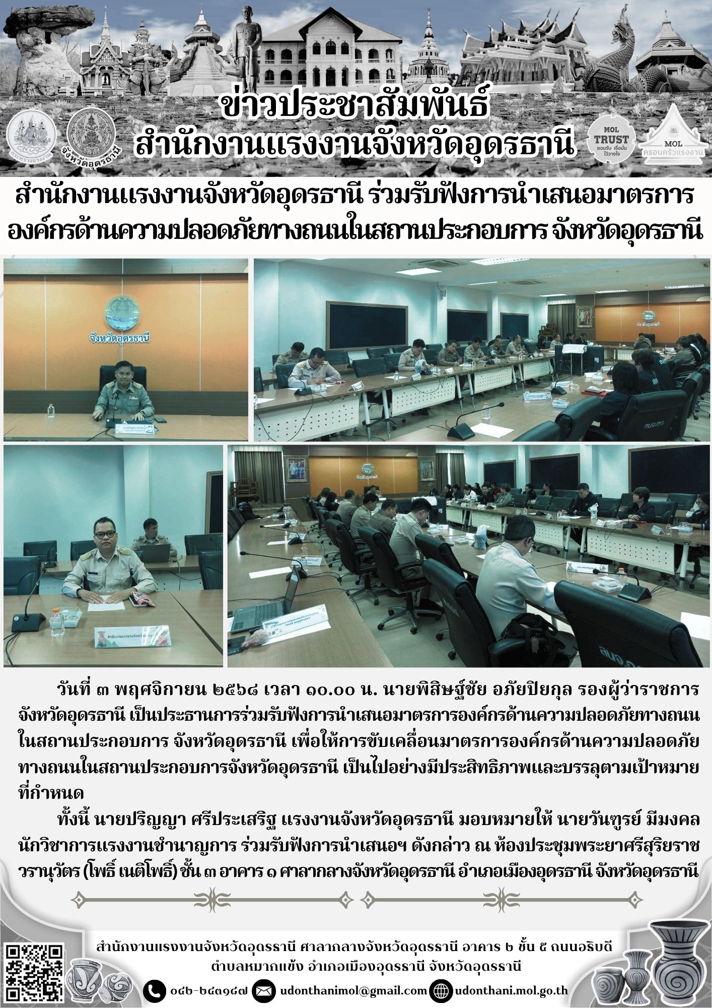 สำนักงานแรงงานจังหวัดอุดรธานี ร่วมรับฟังการนำเสนอมาตรการ องค์กรด้านความปลอดภัยทางถนนในสถานประกอบการ จังหวัดอุดรธานี