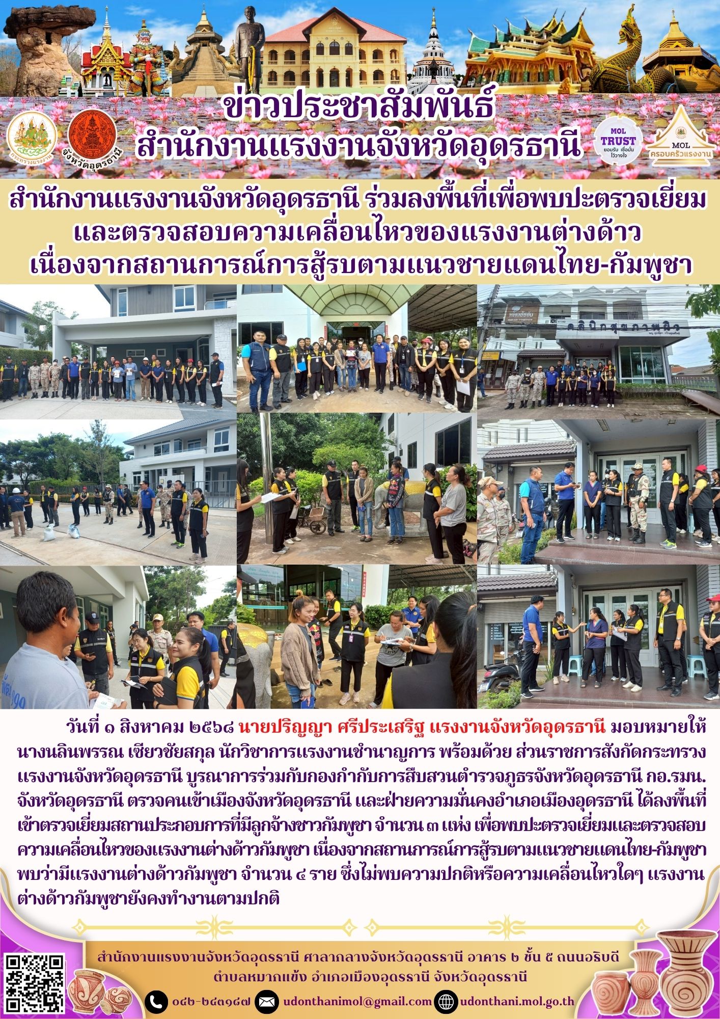 สำนักงานแรงงานจังหวัดอุดรธานี ร่วมลงพื้นที่เพื่อพบปะตรวจเยี่ยม และตรวจสอบความเคลื่อนไหวของแรงงานต่างด้าว เนื่องจากสถานการณ์การสู้รบตามแนวชายแดนไทย-กัมพูชา