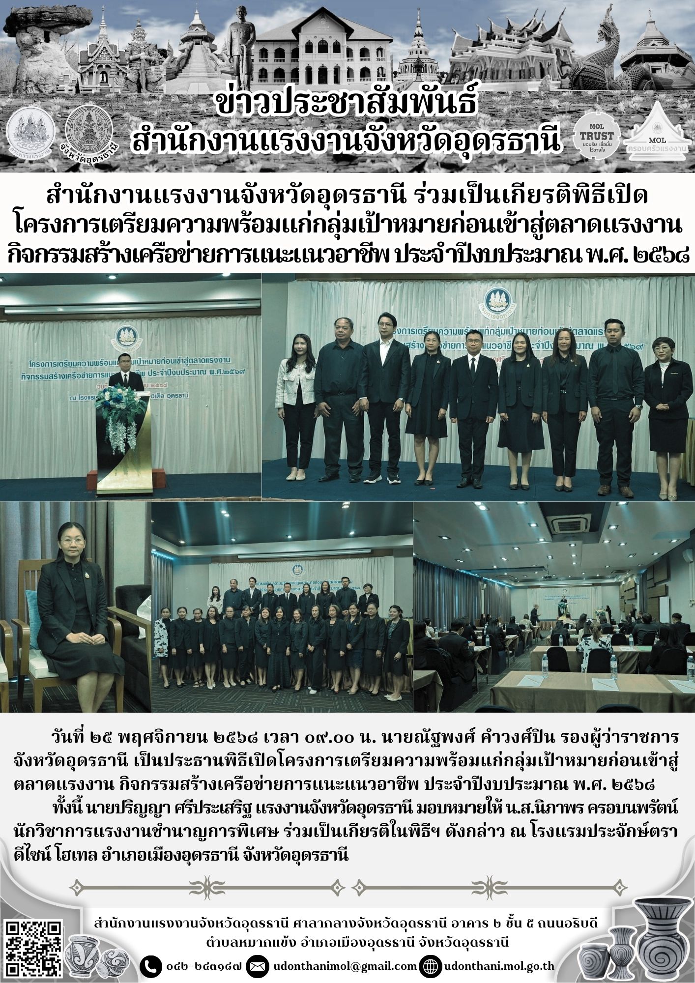 สำนักงานแรงงานจังหวัดอุดรธานี ร่วมเป็นเกียรติพิธีเปิด โครงการเตรียมความพร้อมแก่กลุ่มเป้าหมายก่อนเข้าสู่ตลาดแรงงาน กิจกรรมสร้างเครือข่ายการแนะแนวอาชีพ ประจำปีงบประมาณ พ.ศ. ๒๕๖๘
