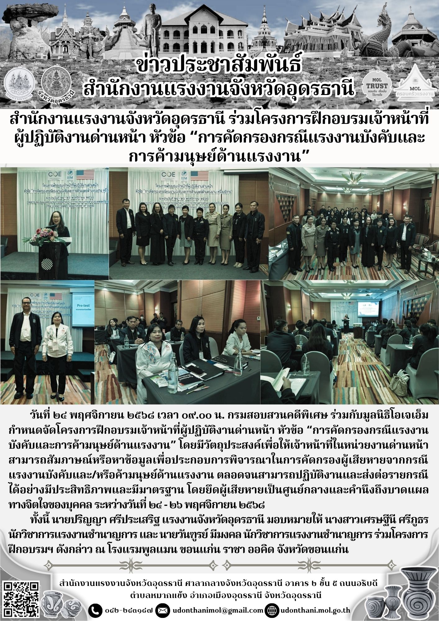 สำนักงานแรงงานจังหวัดอุดรธานี ร่วมโครงการฝึกอบรมเจ้าหน้าที่ ผู้ปฏิบัติงานด่านหน้า หัวข้อ “การคัดกรองกรณีแรงงานบังคับและ การค้ามนุษย์ด้านแรงงาน”