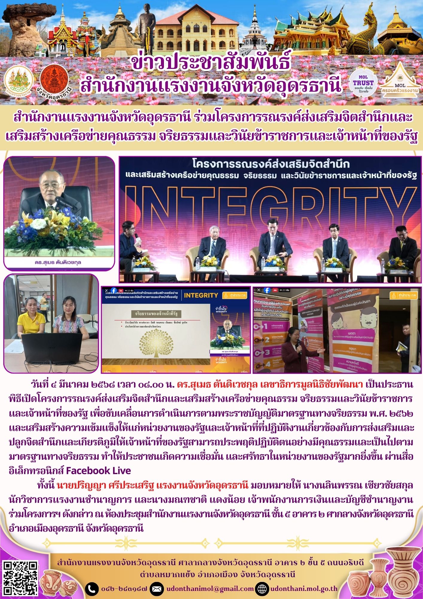 สำนักงานแรงงานจังหวัดอุดรธานี ร่วมโครงการรณรงค์ส่งเสริมจิตสำนึกและ เสริมสร้างเครือข่ายคุณธรรม จริยธรรมและวินัยข้าราชการและเจ้าหน้าที่ของรัฐ