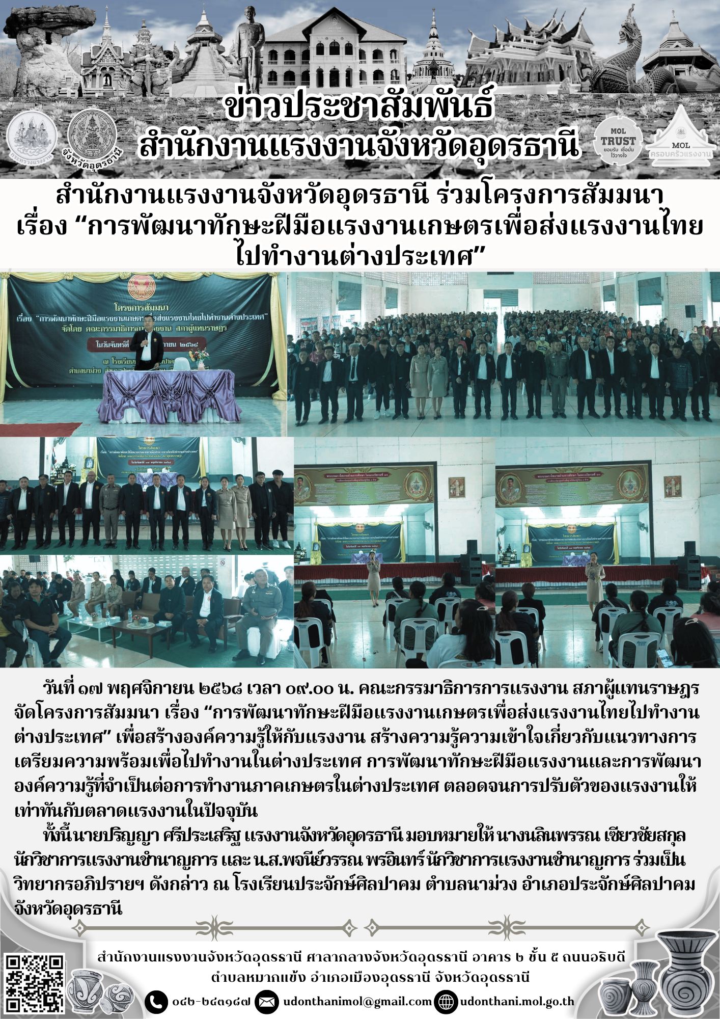 สำนักงานแรงงานจังหวัดอุดรธานี ร่วมโครงการสัมมนา เรื่อง “การพัฒนาทักษะฝีมือแรงงานเกษตรเพื่อส่งแรงงานไทย ไปทำงานต่างประเทศ”