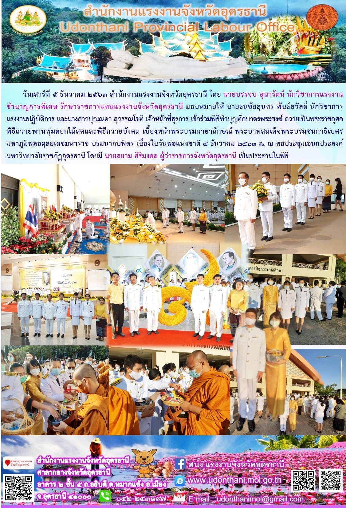 สำนักงานแรงงานจังหวัดอุดรธานี เข้าร่วมพิธีทำบุญตักบาตรพระสงฆ์ ถวายเป็นพระราชกุศล พิธีถวายพานพุ่มดอกไม้สดและพิธีถวายบังคม เบื้องหน้าพระบรมฉายาลักษณ์ พระบาทสมเด็จพระบรมชนกาธิเบศร มหาภูมิพลอดุลยเดชมหาราช บรมนาถบพิตร เนื่องในวันพ่อแห่งชาติ ๕ ธันวาคม ๒๕๖๓