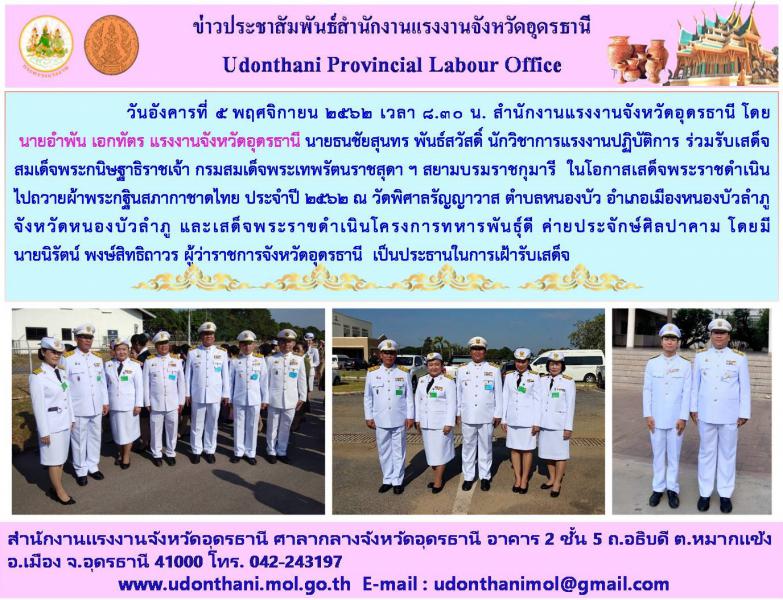 สำนักงานแรงงานจังหวัดอุดรธานี และข้าราชการพนักงาน ร่วมรับเสด็จ สมเด็จพระกนิษฐาธิราชเจ้า กรมสมเด็จพระเทพรัตนราชสุดา ฯ สยามบรมราชกุมารี ในโอกาสเสด็จพระราชดำเนินไปถวายผ้าพระกฐินสภากาชาดไทย ประจำปี 2562