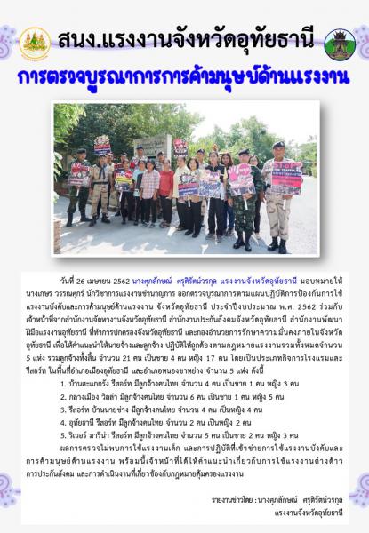 สำนักงานแรงงานจังหวัดอุทันธานี ออกตรวจบุรณาการตามแผนปฏิบัติการป้องกันการใช้แรงงานบังคับและการค้ามนุษย์ด้านแรงงาน จังหวัดอุทัยธานี