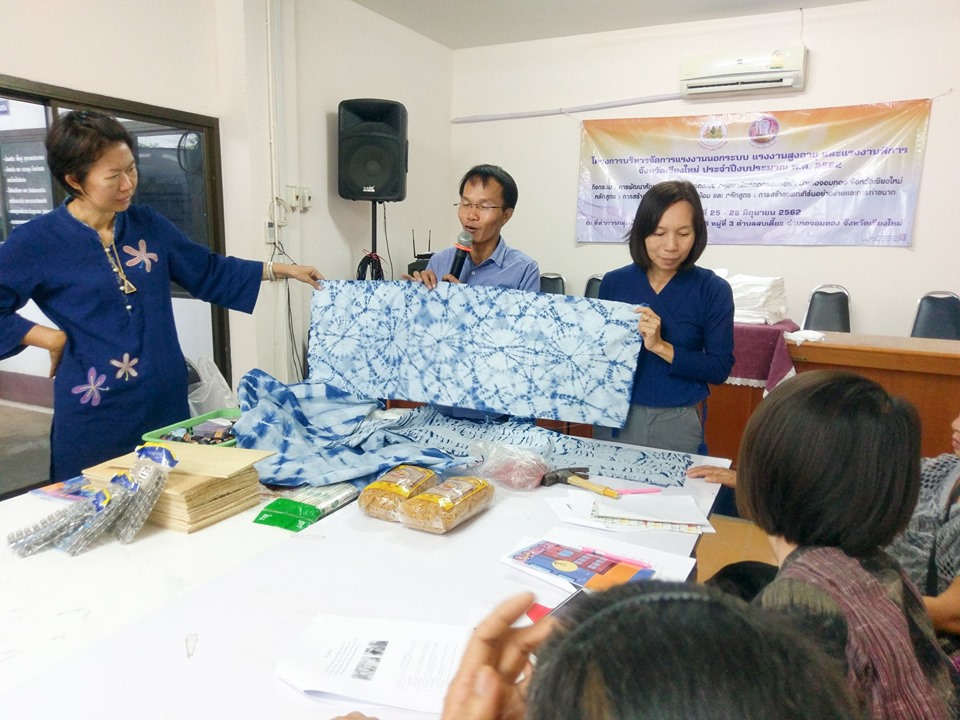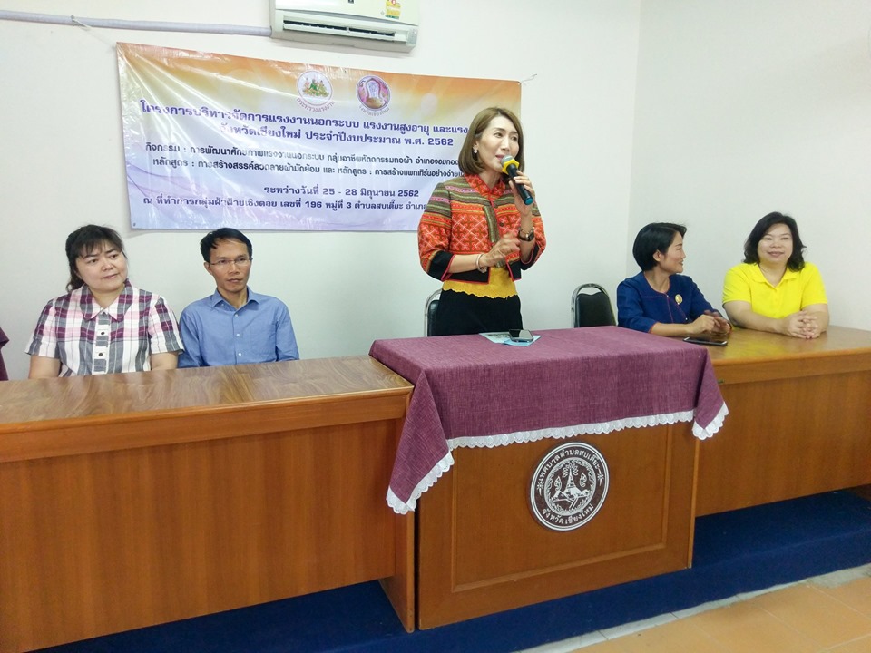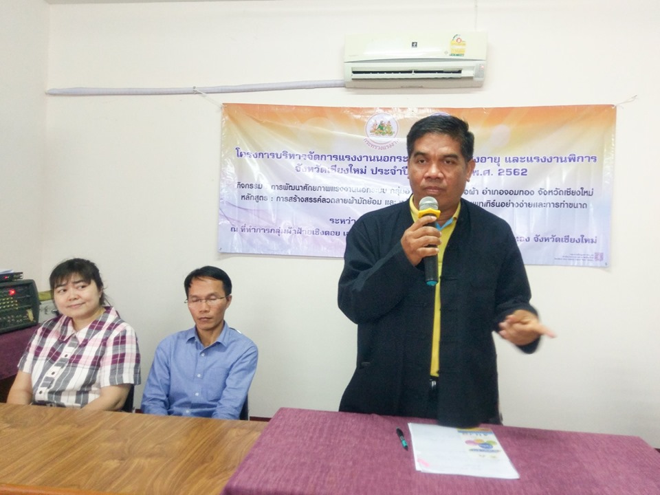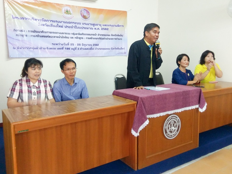 เมื่อวันที่ 25 มิถุนายน 2562 สำนักงานแรงงานจังหวัดเชียงใหม่ โดย จ่าสิบเอก ปรีชา จันทร์ศรี นักวิชาการแรงงานชำนาญการพิเศษ รักษาราชการแทน แรงงานจังหวัดเชียงใหม่ เป็นประธานเปิดการอบรม โครงการพัฒนาศักยภาพแรงงานนอกระบบ กลุ่มอาชีพหัตถกรรมทอผ้า อำเภอจอมทอง จังหวัดเชียงใหม่ หลักสูตร การสร้างสรรค์ลวดลายผ้ามัดย้อม และหลักสูตร การสร้างแพทเทิร์นอย่างง่ายและการทำขนาด ระหว่าง วันที่ 25-28 มิถุนายน 2562 ณ ห้องประชุมสำนักงานเทศบาลตำบลสบเตี๊ยะ ตำบลสบเตี๊ยะ อำเภอจอมทอง จังหวัดเชียงใหม่ โดยมีผู้แทนจาก สำนักงานสวัสดิการและคุ้มครองแรงงานจังหวัด สำนักงานประกันสังคมจังหวัด และศูนย์การศึกษานอกระบบและการศึกษาตามอัธยาศัยอำเภอจอมทอง และสำนักงานเทศบาลตำบลสบเตี๊ยะ ร่วมเป็นเกียรติในพิธีเปิด และบรรยายให้ความรู้แก่กลุ่มแรงงานนอกระบบ วัตถุประสงค์เพื่อเป็นต้นแบบการให้ความช่วยเหลือแรงงานนอกระบบ แรงงานสูงอายุ และแรงงานพิการ แบบบูรณาการในพื้นที่จังหวัดเชียงใหม่ และฝึกอาชีพเพื่อเพิ่มทักษะ ส่งเสริมอาชีพให้มีรายได้เพิ่มขึ้น ได้รับความคุ้มครองและมีหลักประกันทางสังคม ส่งเสริมให้มีความรู้ด้านอาชีวอนามัยและความปลอดภัยในการทำงาน มีคุณภาพชีวิตที่ดี