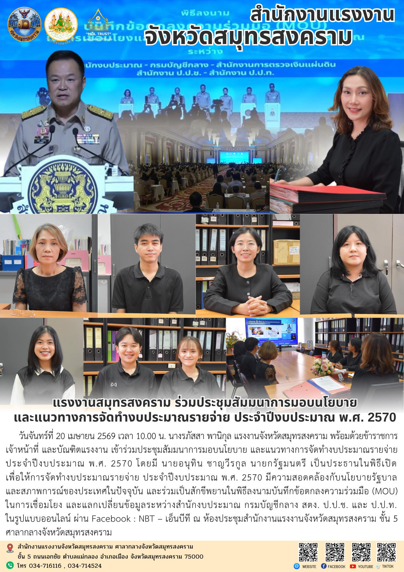 แรงงานสมุทรสงคราม ร่วมประชุมสัมมนาการมอบนโยบาย และแนวทางการจัดทำงบประมาณรายจ่าย ประจำปีงบประมาณ พ.ศ. 2570