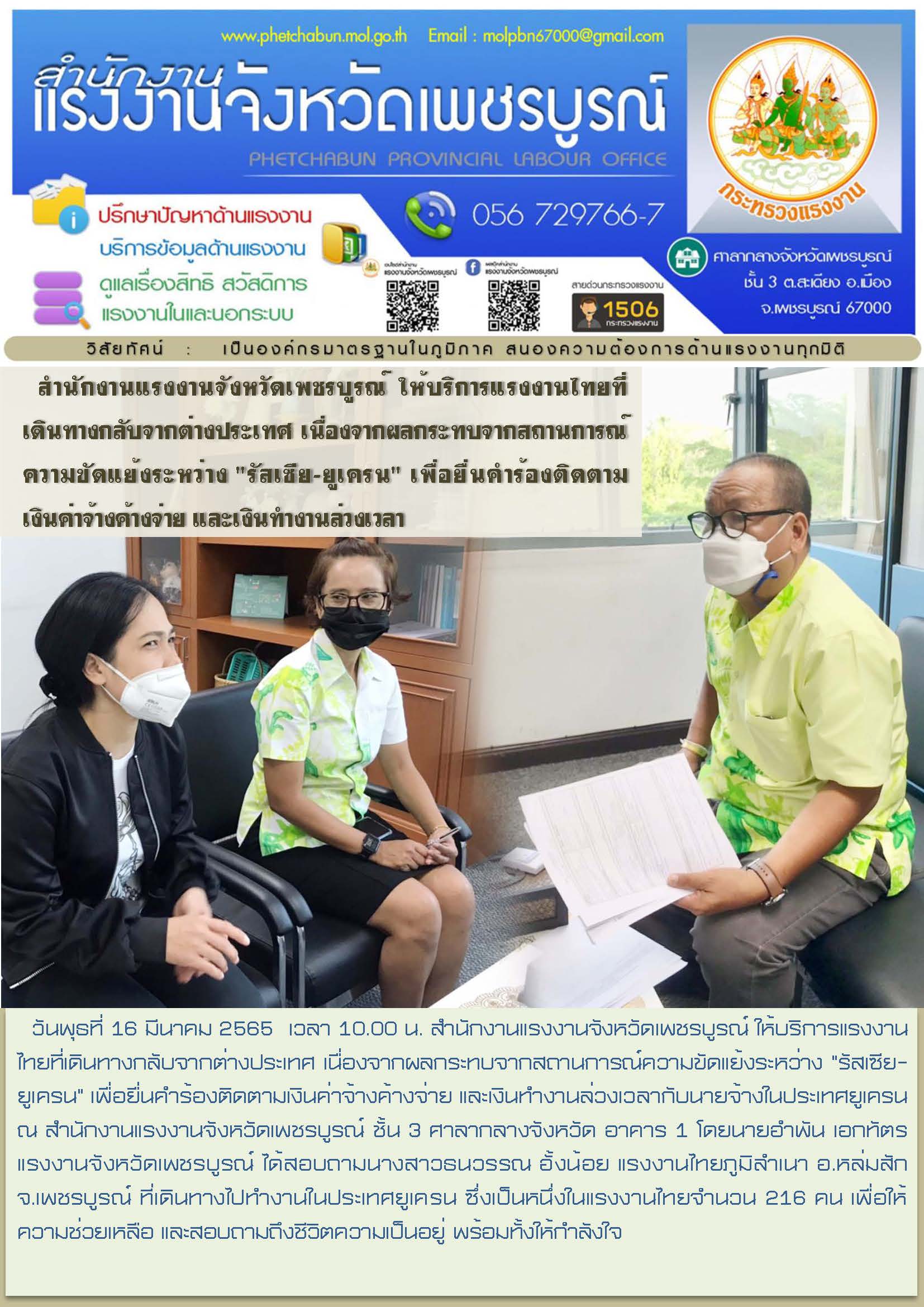 สำนักงานแรงงานจังหวัดเพชรบูรณ์ ให้บริการแรงงานไทยที่เดินทางกลับจากต่างประเทศ เนื่องจากผลกระทบจากสถานการณ์ความขัดแย้งระหว่าง “รัสเซีย-ยูเครน” เพื่อยื่นคำร้องติดตามเงินค่าจ้างค้างจ่าย และเงินทำงานล่วงเวลา