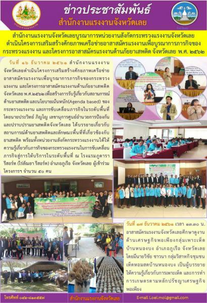 สำนักงานแรงงานจังหวัดเลยบูรณาการหน่วยงานในสังกัดกระทรวงแรงงานจังหวัดเลย ดำเนินโครงการเสริมสร้างศักยภาพเครือข่ายอาสาสมัครแรงงาน เพื่อบูรณาการภารกิจของกระทรวงแรงงาน และโครงการอาสาสมัครแรงงานต้านภัยยาเสพติด จังหวัดเลย ประจำปีงบประมาณ พ.ศ. 2562