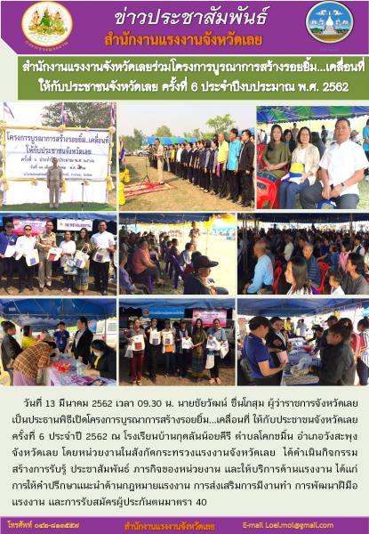 สำนักงานแรงงานจังหวัดเลยร่วมโครงการบูรณาการสร้างรอยยิ้ม…เคลื่อนที่ให้กับประชาชนจังหวัดเลย ครั้งที่ 6 ประจำปีงบประมาณ พ.ศ. 2562