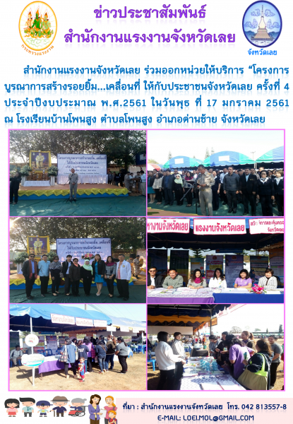 สำนักงานแรงงานจังหวัดเลย ร่วมออกหน่วยให้บริการ “โครงการบูรณาการสร้างรอยยิ้ม…เคลื่อนที่ ให้กับประชาชนจังหวัดเลย ครั้งที่ 4 ประจำปีงบประมาณ พ.ศ.2561" ในวันพุธ ที่ 17 มกราคม 2561 ณ โรงเรียนบ้านโพนสูง ตำบลโพนสูง อำเภอด่านซ้าย จังหวัดเลย