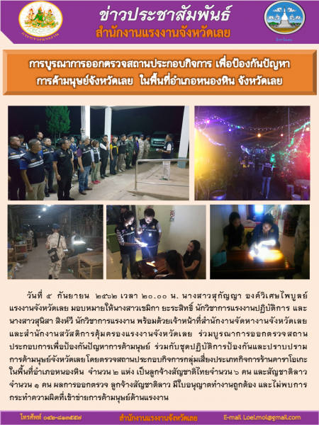 สำนักงานแรงงานจังหวัดเลย ร่วมการบูรณาการออกตรวจสถานประกอบกิจการ เพื่อป้องกันปัญหา การค้ามนุษย์จังหวัดเลย ในพื้นที่อำเภอหนองหิน จังหวัดเลย