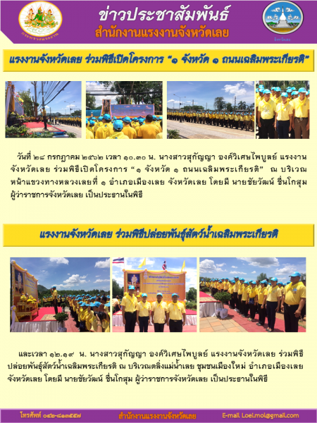 สำนักงานแรงงานจังหวัดเลย ร่วมพิธีเปิดโครงการ “1 จังหวัด 1 ถนนเฉลิมพระเกียรติ” และร่วมพิธีปล่อยพันธุ์สัตว์น้ำเฉลิมพระเกียรติ