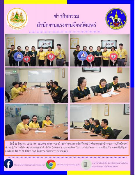 วันนี้ 26 มิถุนายน 2562 เวลา 15.00 น. นางสาวปราณี ชลารักษ์ แรงงานจังหวัดแพร่ นำข้าราชการสำนักงานแรงงานจังหวัดแพร่ เข้าพบผู้บริหารบริษัท สยามโกลบอลเฮ้าส์ จำกัด (มหาชน) สาขาแพร่ เพื่อหารือการเข้าร่วมโครงการรณรงค์ป้องกันและแก้ไขปัญหายาเสพติด TO BE NUMBER ONE ในสถานประกอบการ จังหวัดแพร่