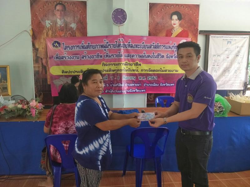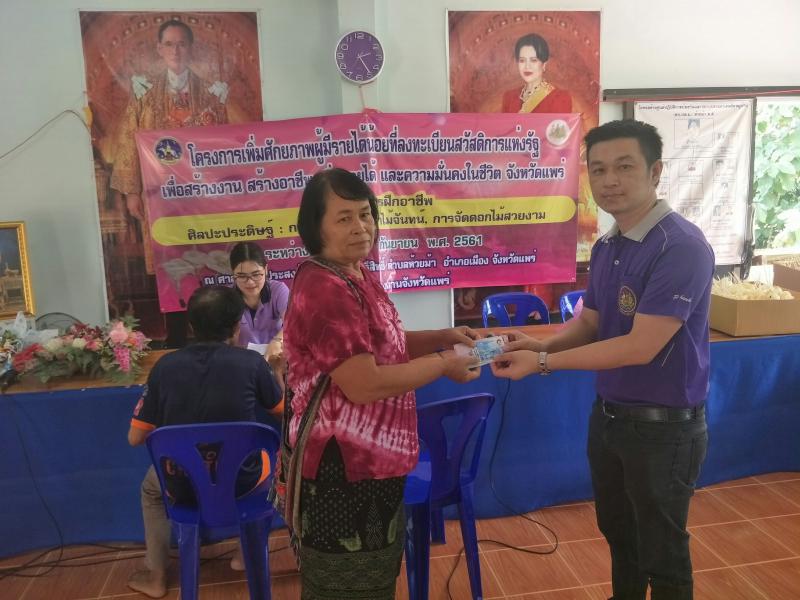 วันนี้ (อาทิตย์ ที่ 9 กันยายน 2561) นางสาวปราณี ชลารักษ์ แรงงานจังหวัดแพร่ มอบหมายให้นายชูเกียรติ สารดี นักวิชาการแรงงานชำนาญการ พร้อมด้วยเจ้าหน้าที่สำนักงานแรงงานจังหวัดแพร่ ลงพื้นที่ตำบลห้วยม้า เพื่อปิดการฝึกอาชีพเนื่องในโครงการเพิ่มศักยภาพผู้มีรายได้น้อยที่ลงทะเบียนสวัสดิการแห่งรัฐ เพื่อสร้างงาน สร้างอาชีพ เพิ่มรายได้ และความมั่นคงในชีวิต จังหวัดแพร่ ประจำปี 2561 กลุ่มฝึกอาชีพศิลปะประดิษฐ์ (ฝึกระหว่างวันที่ 7-9 กันยายน 2561) ณ ศาลาอเนกประสงค์ หมู่ที่ 5 บ้านศรีสิทธิ์ ตำบลห้วยม้า อำเภอเมือง จังหวัดแพร่ ในการนี้ ทางสำนักงานแรงงานจังหวัดแพร่ ขอขอบพระคุณทุกภาคส่วนที่เกี่ยวข้องและให้ความร่วมมือในทุกๆด้านมา ณ โอกาสนี้ สุดท้ายนี้หวังเป็นอย่างยิ่งว่าการจัดการฝึกโครงการฯในครั้งนี้จะช่วยส่งเสริม พัฒนา และยกระดับคุณภาพชีวิตของพี่น้องประชาชนชาวเมืองแพร่ได้อย่างดียิ่ง ขอบพระคุณ….
