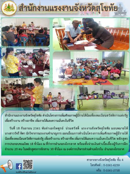 สำนักงานแรงงานจังหวัดสุโขทัย ดำเนินโครงการเพิ่มศักยภาพผู้มีรายได้น้อยที่ลงทะเบียนสวัสดิการแห่งรัฐเพื่อสร้างงาน สร้างอาชีพ เพิ่มรายได้และความมั่นคงในชีวิต