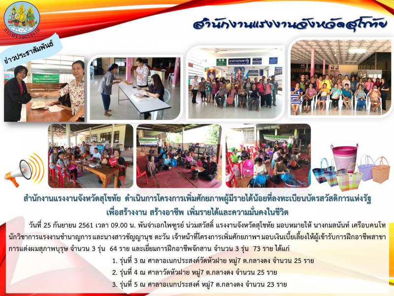 สำนักงานแรงงานจังหวัดสุโขทัย ดำเนินการโครงการเพิ่มศักยภาพผู้มีรายได้น้อยที่ลงทะเบียนบัตรสวัสดิการแห่งรัฐ เพื่อสร้างงาน สร้างอาชีพ เพิ่มรายได้และความมั่นคงในชีวิต