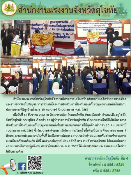 สำนักงานแรงงานจังหวัดสุโขทัยจัดอบรมโครงการเสริมสร้างศักยภาพเครือข่ายอาสาสมัครแรงงานจังหวัดสุโขทัยบูรณาการร่วมกับโครงการส่งเสริมการป้องกันและแก้ไขปัญหายาเสพติดในสถานประกอบการที่มีลูกจ้างต่ำกว่า 10 คน ประจำปีงบประมาณ พ.ศ. 2562