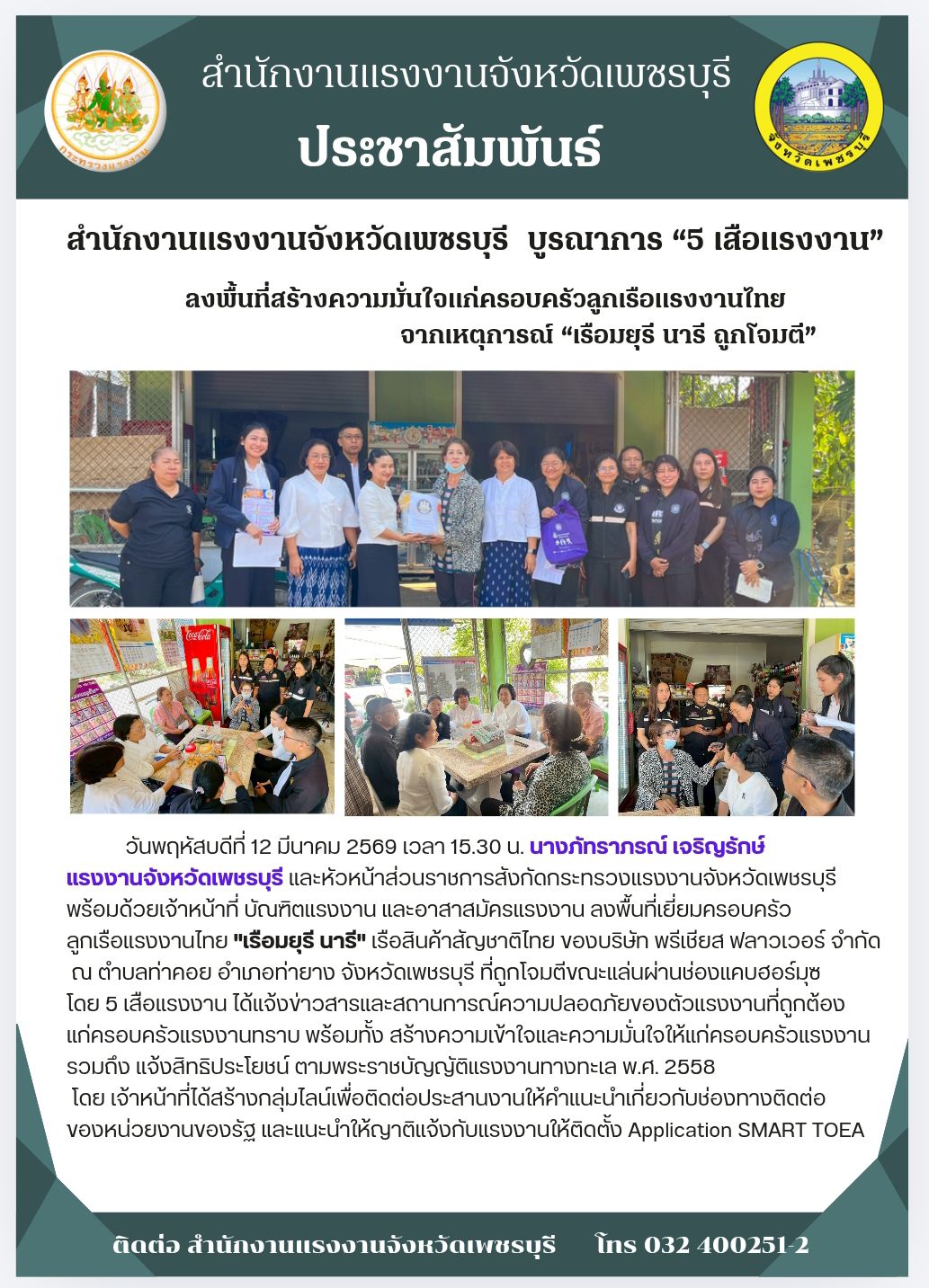 สำนักงานแรงงานจังหวัดเพชรบุรี บูรณาการ “5 เสือแรงงาน” ลงพื้นที่สร้างความมั่นใจแก่ครอบครัวลูกเรือแรงงานไทย จากเหตุการณ์ “เรือมยุรี นารี ถูกโจมตี”