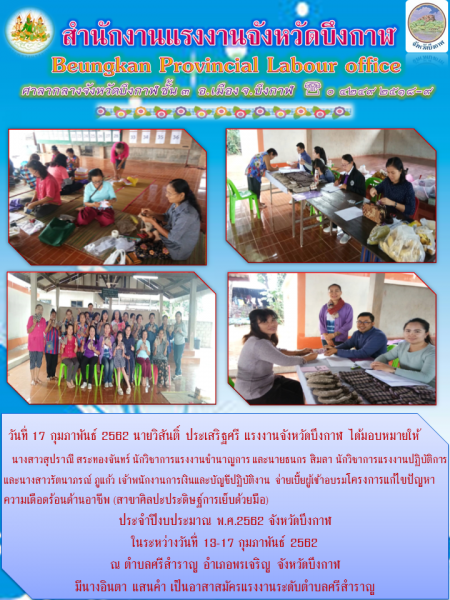 สำนักงานแรงงานจังหวัดบึงกาฬ จ่ายเบี้ยเลี้ยงผู้เข้าร่วมฝึกอบรมโครงการแก้ไขปัญหาความเดือดร้อนด้านอาชีพ ปีงบประมาณ 2562 สาขาศิลปะประดิษฐ์การเย็บด้วยมือ