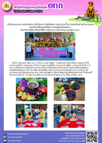 สำนักงานแรงงานจังหวัดตาก ปิดโครงการเพิ่มขีดความสามารถในการแข่งขันด้านค้าชายแดน และขับเคลื่อนเขตพัฒนาเศรษฐกิจพิเศษตาก กิจกรรม พัฒนาทักษะฝีมือ กลุ่มแรงงานนอกระบบและผู้ว่างงาน