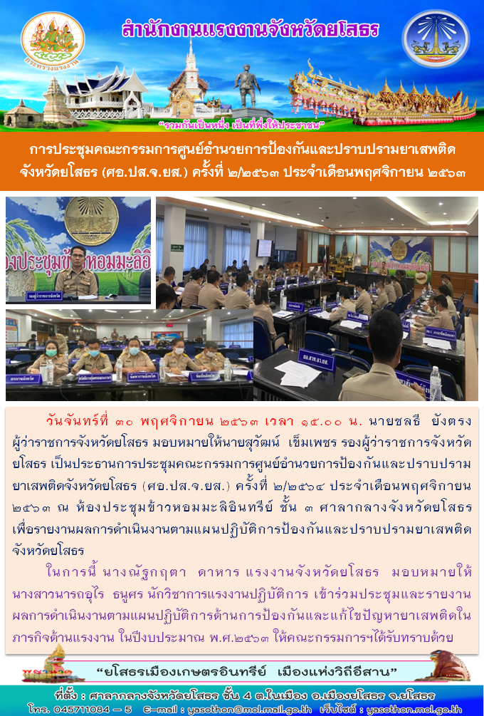 สำนักงานแรงงานจังหวัดยโสธร เข้าร่วมประชุมคณะกรรมการศูนย์อำนวยการป้องกันและปราบปรามยาเสพติด จังหวัดยโสธร (ศอ.ปส.จ.ยส.) ครั้งที่ 2/2563 ประจำเดือนพฤศจิกายน 2563