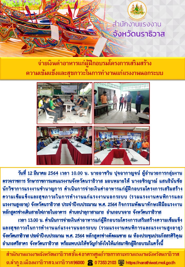 สำนักงานแรงงานจังหวัดนราธิวาส จ่ายเงินค่าอาหารแก่ผู้ฝึกอบรมโครงการเสริมสร้างความเข้มแข็งและสุขภาวะในการทำงานแก่แรงงานนอกระบบ