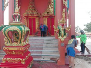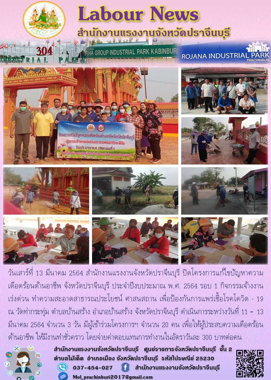 สำนักงานแรงงานจังหวัดปราจีนบุรี ปิดโครงการแก้ไขปัญหาความเดือดร้อนด้านอาชีพ จังหวัดปราจีนบุรี ประจำปีงบประมาณ พ.ศ. 2564 รอบ 1 กิจกรรมจ้างงานเร่งด่วน ทำความสะอาดสาธารณประโยชน์ ศาสนสถาน เพื่อป้องกันการแพร่เชื้อโรคโควิด – 19