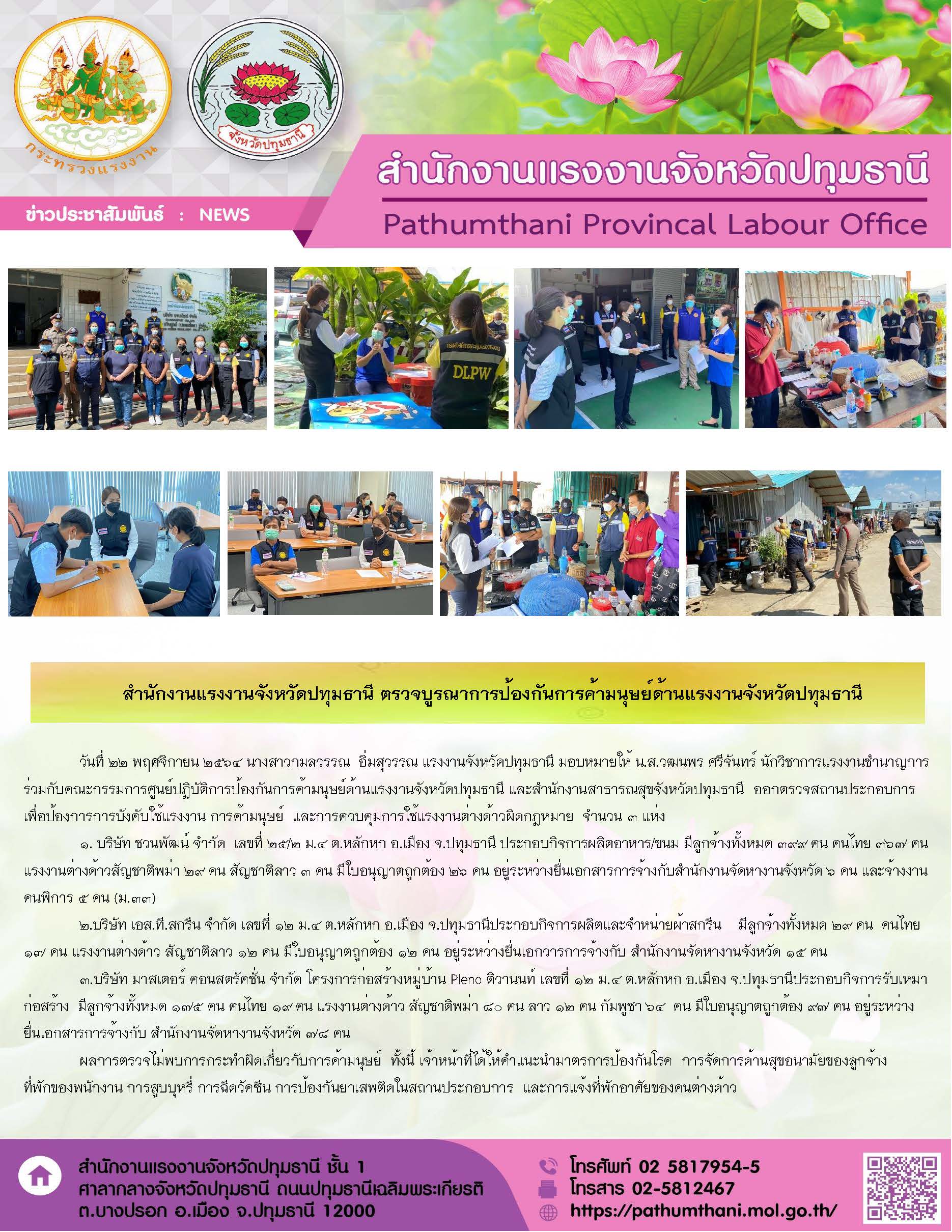 สำนักงานแรงงานจังหวัดปทุมธานี ตรวจบูรณาการป้องกันการค้ามนุษย์ด้านแรงงานจังหวัดปทุมธานี