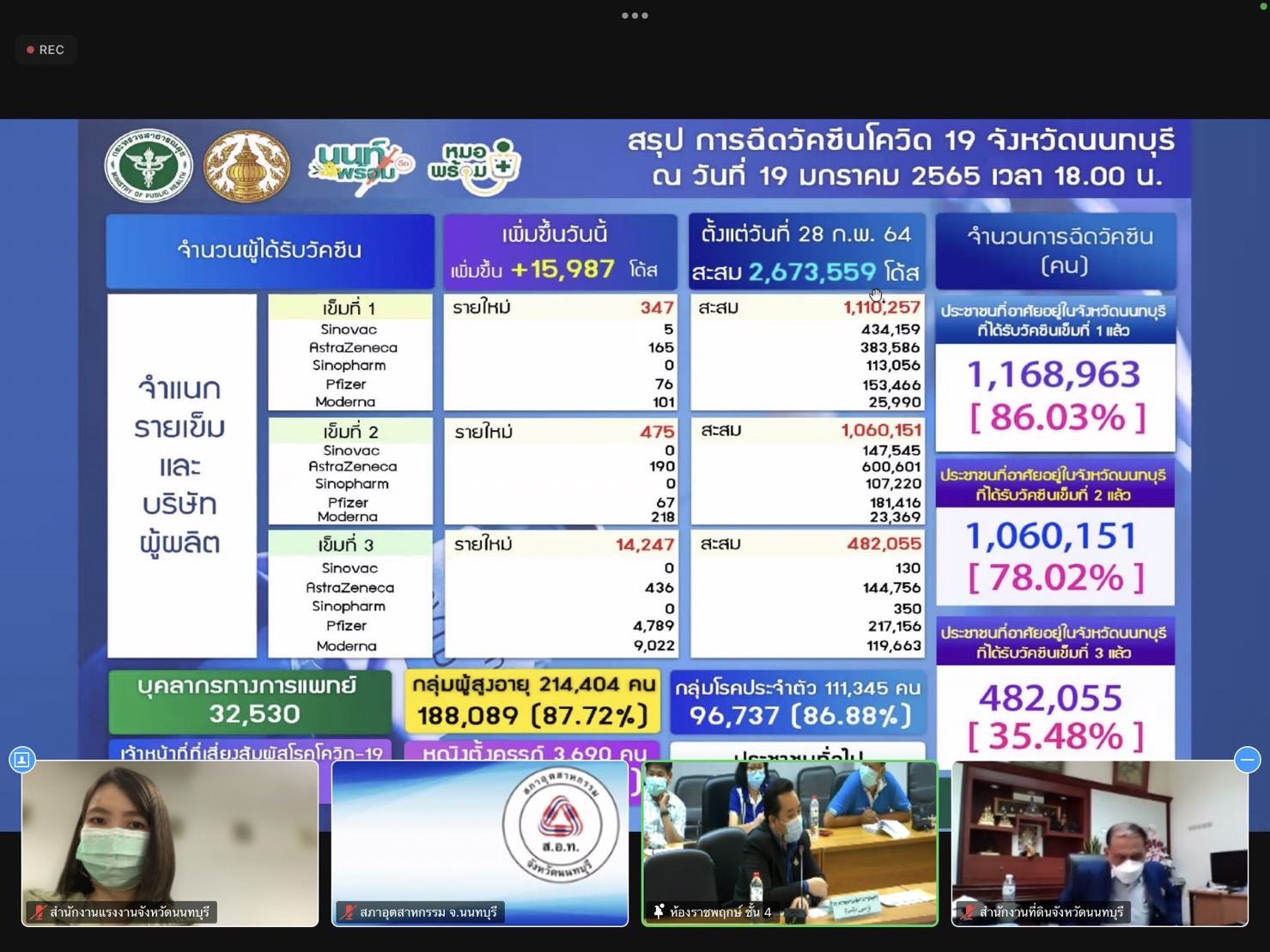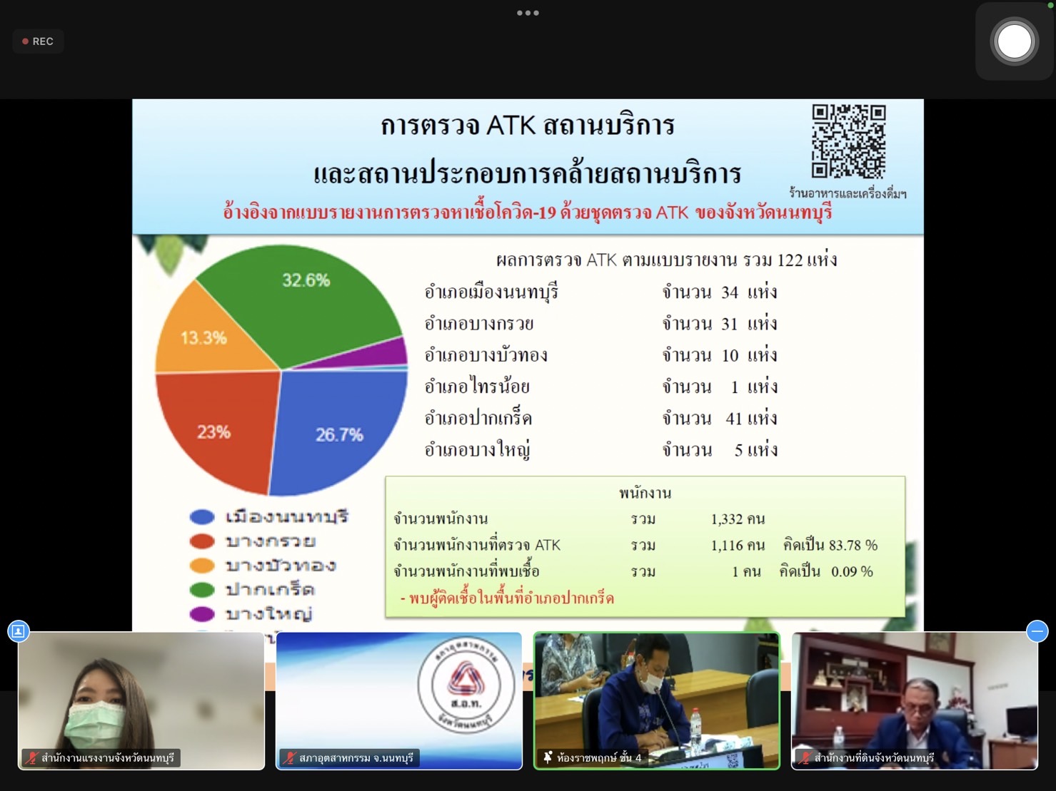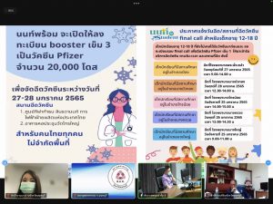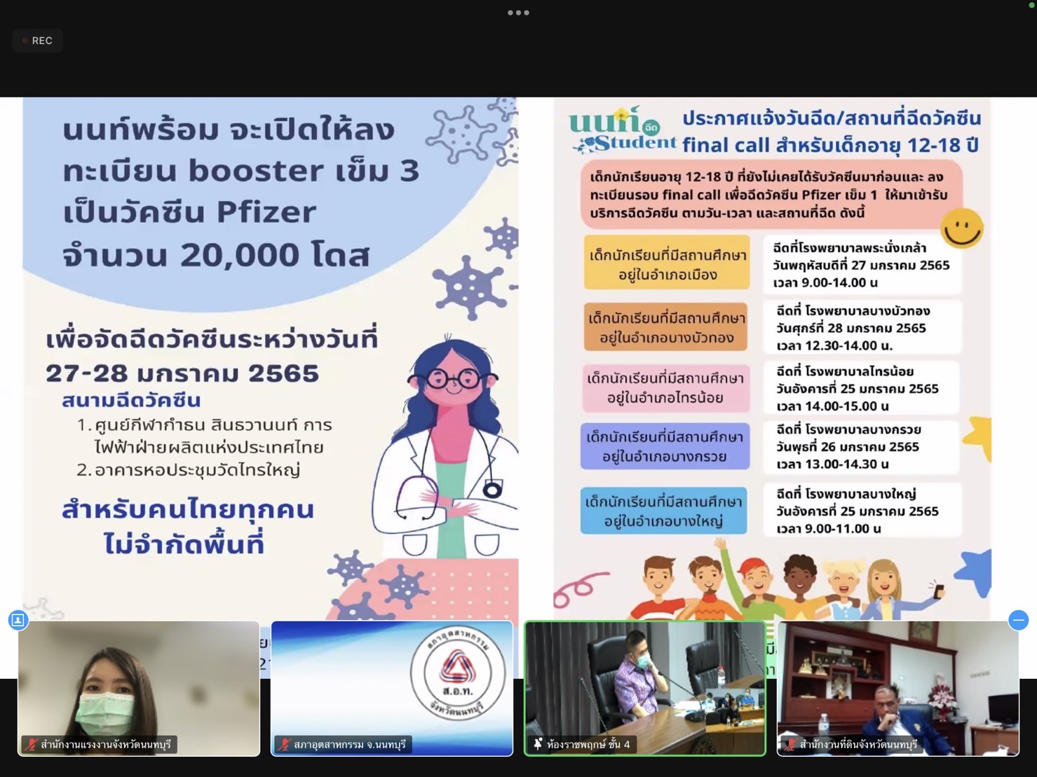 วันที่ 21 มกราคม 2565 นายวิชิตร สุวรรณมาก แรงงานจังหวัดนนทบุรี มอบหมายให้ นางสาวโสภิตา อินทรีย์วงศ์ นักวิชาการแรงงานชำนาญการ ร่วมประชุมคณะกรรมการโรคติดต่อจังหวัดนนทบุรี เพื่อหารือเกี่ยวกับสถานการณ์การแพร่ระบาดของโรคติดเชื้อไวรัสโคโรนา 2019 ในจังหวัดนนทบุรี ผ่านระบบวีดีทัศน์ทางไกล (VCUBE-ZOOM) โดยมี นายสุจินต์ ไชยชุมศักดิ์ ผู้ว่าราชการจังหวัดนนทบุรี เป็นประธานการประชุม
