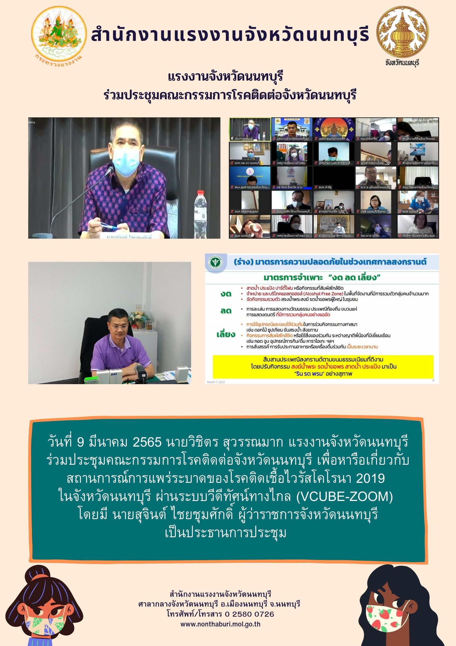 วันที่ 9 มีนาคม 2565 นายวิชิตร สุวรรณมาก แรงงานจังหวัดนนทบุรี ร่วมประชุมคณะกรรมการโรคติดต่อจังหวัดนนทบุรี เพื่อหารือเกี่ยวกับสถานการณ์การแพร่ระบาดของโรคติดเชื้อไวรัสโคโรนา 2019 ในจังหวัดนนทบุรี ผ่านระบบวีดีทัศน์ทางไกล (VCUBE-ZOOM) โดยมี นายสุจินต์ ไชยชุมศักดิ์ ผู้ว่าราชการจังหวัดนนทบุรี เป็นประธานการประชุม