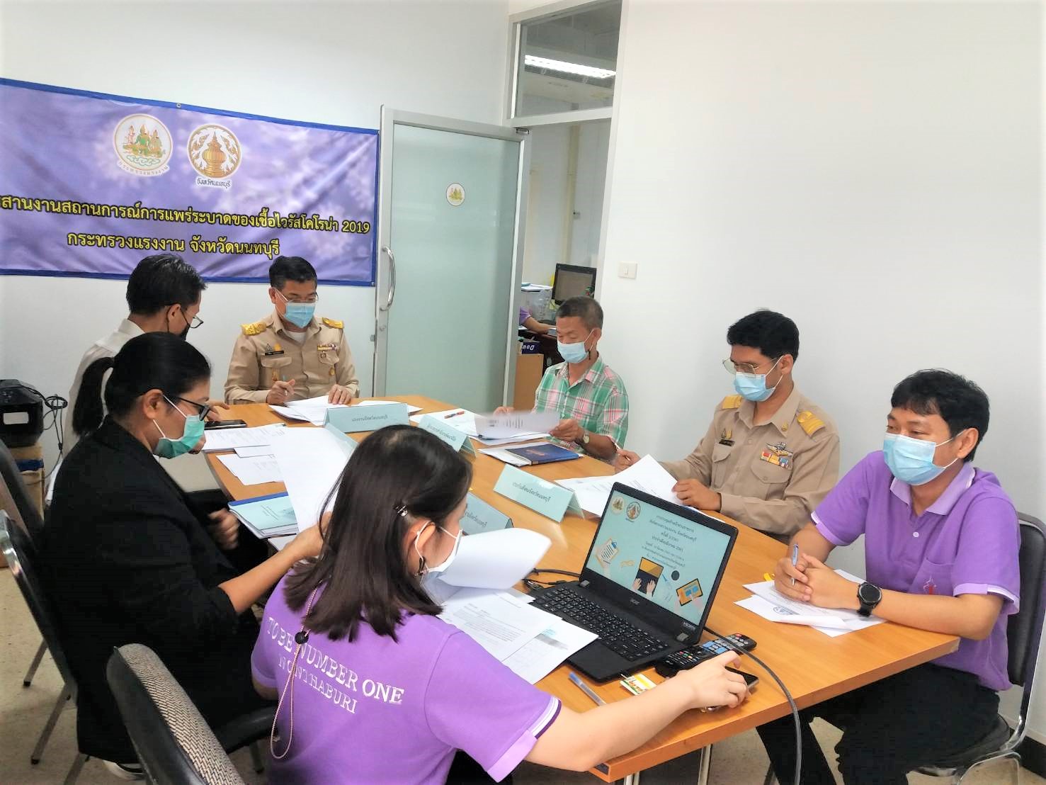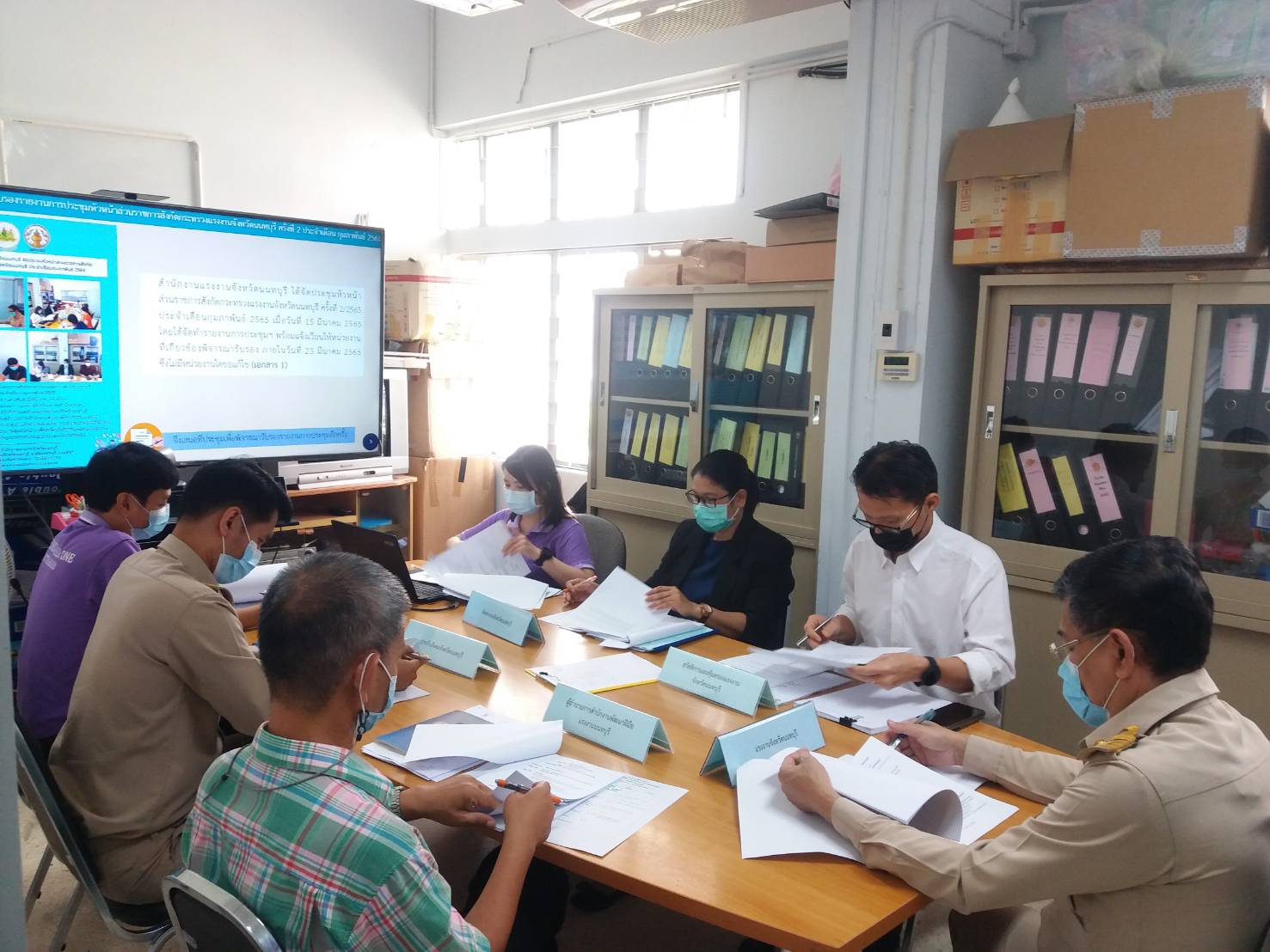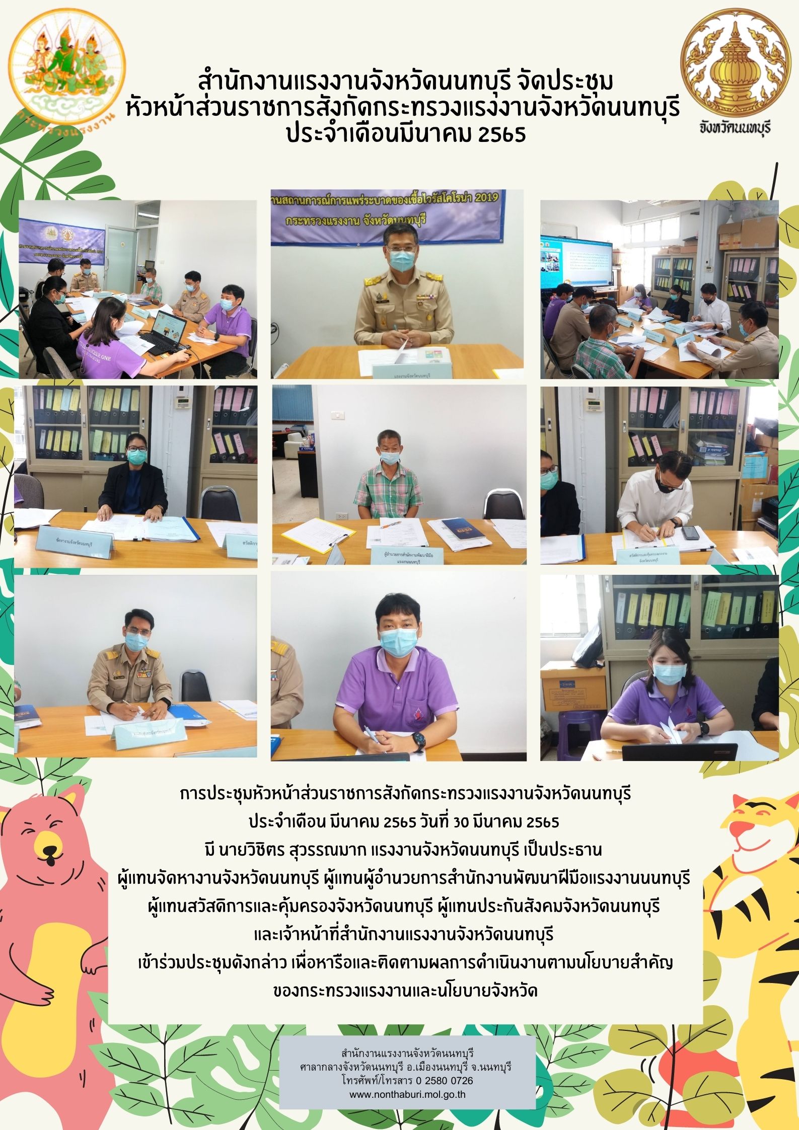 การประชุมหัวหน้าส่วนราชการสังกัดกระทรวงแรงงานจังหวัดนนทบุรี ประจำเดือน มีนาคม 2565 วันที่ 30 มีนาคม 2565 มี นายวิชิตร สุวรรณมาก แรงงานจังหวัดนนทบุรี เป็นประธาน ผู้แทนจัดหางานจังหวัดนนทบุรี ผู้แทนผู้อำนวยการสำนักงานพัฒนาฝีมือแรงงานนนทบุรี ผู้แทนสวัสดิการและคุ้มครองจังหวัดนนทบุรี ผู้แทนประกันสังคมจังหวัดนนทบุรี และเจ้าหน้าที่สำนักงานแรงงานจังหวัดนนทบุรี เข้าร่วมประชุมดังกล่าว เพื่อหารือและติดตามผลการดำเนินงานตามนโยบายสำคัญของกระทรวงแรงงานและนโยบายจังหวัด