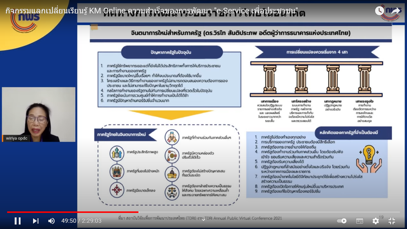 วันที่ 18 พฤษภาคม 2565 นายวิชิตร สุวรรณมาก แรงงานจังหวัดนนทบุรี มอบหมายให้ นายวีรจิตต์ สิทธิชัย นักวิชาการแรงงานชำนาญการ และนางสาวณฐภัค นิลศรี นักวิชาการแรงงาน ร่วมรับฟังกิจกรรมแลกเปลี่ยนเรียนรู้ KM Online เรื่อง “ความสำเร็จของการพัฒนา E-Service เพื่อประชาชน” และกิจกรรมการเผยแพร่ผลงานการพัฒนาการบริการของหน่วยงานของรัฐ เรื่อง “นวัตกรรมบริการภาครัฐ คิด ทำ ใช้ ให้ประชาชน” เพื่อเผยแพร่องค์ความรู้ เทคนิควิธีการในการพัฒนาการบริการภาครัฐของหน่วยงานที่มีผลงานโดดเด่น เป็นต้นแบบที่ดีให้แก่หน่วยงานต่างๆนำไปประยุกต์ใช้พัฒนาประสิทธิภาพการบริหารงานภาครัฐ และการให้บริการ รวมทั้งสร้างการรับรู้การบริหารงานภาครัฐและให้บริการรวมทั้งสร้างการรับรู้ให้แก่ประชาชน ได้ทราบถึงความก้าวหน้าและยกระดับประสิทธิภาพการบริการภาครัฐ ซึ่งจะนำไปสู่การสร้างความเชื่อมั่นในระบบราชการ โดย สำนักงานคณะกรรมการพัฒนาระบบราชการ ผ่านสื่ออิเล็กทรอนิกส์ YouTube Live